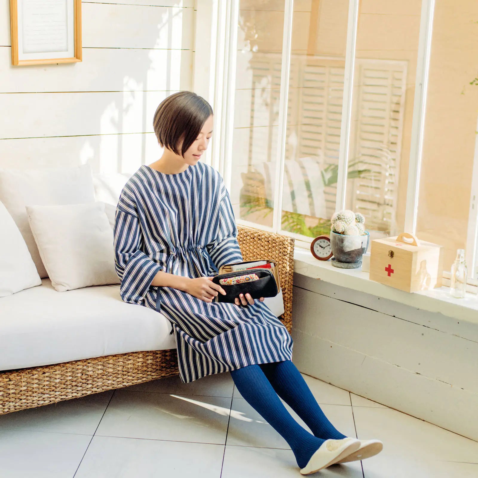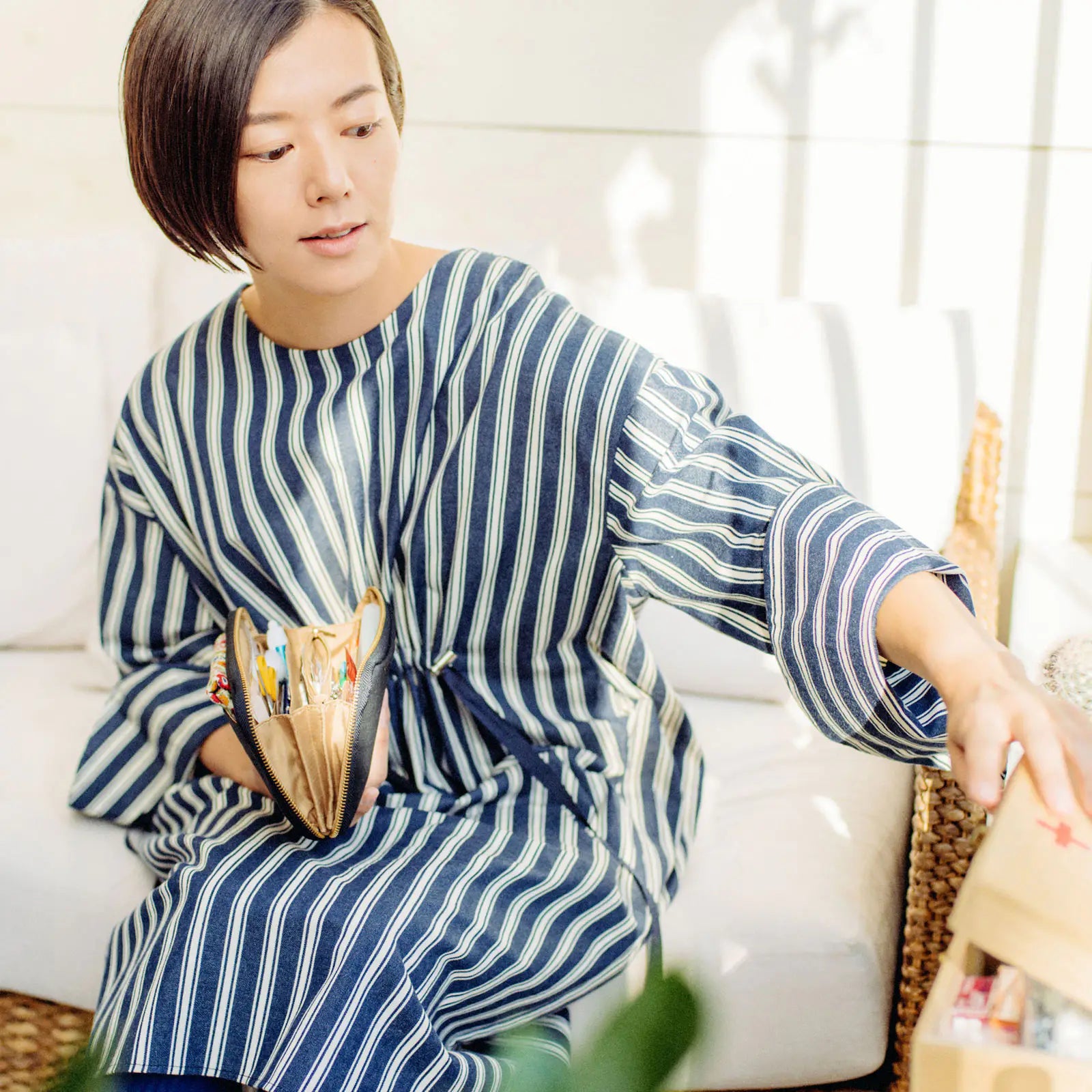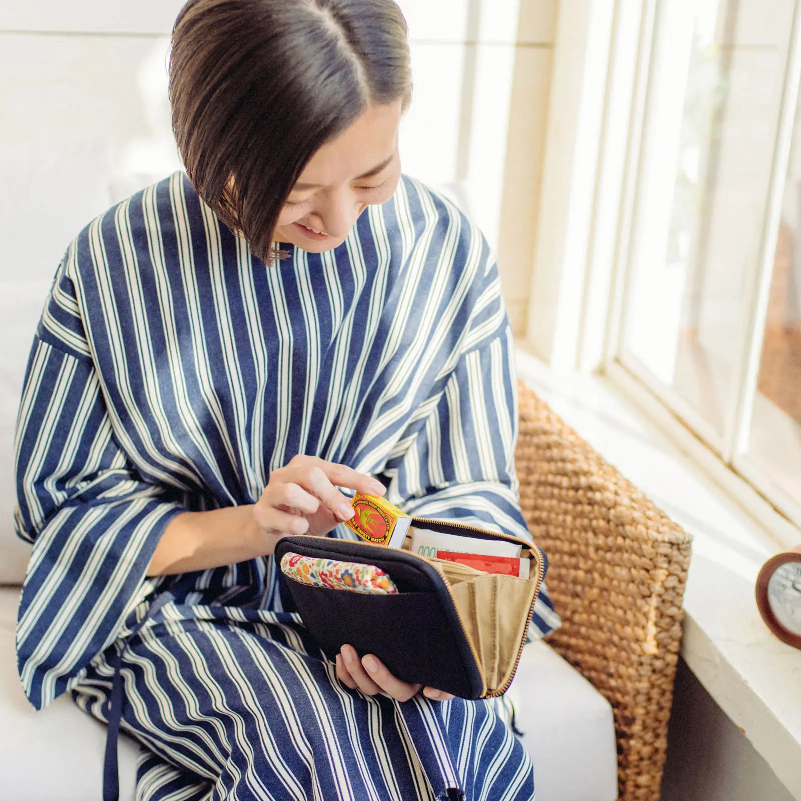 The Drawer Pouch Áne (AH-nay, “older sister” in Japanese) is the size of a wallet and opens accordion-style. The Áne works great as a wallet for your cards and bank books, but it’s also perfect for storing other smaller items, such as writing accessories, tickets, and headphones.
