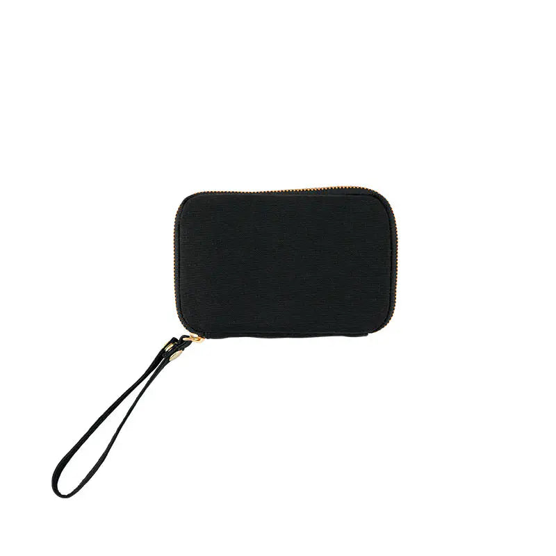 This design features a black cotton material that matches well with any other belongings or bags, and contains a beige interior to complete its nice, subtle look. The zipper pull contains a looped strap for easy handling.