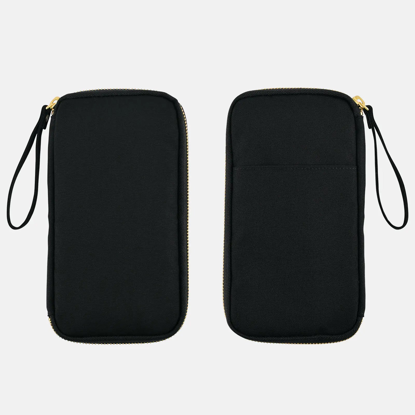 This design features a black cotton material that matches well with any other belongings or bags, and contains a beige interior to complete its nice, subtle look. The zipper pull contains a looped strap for easy handling.