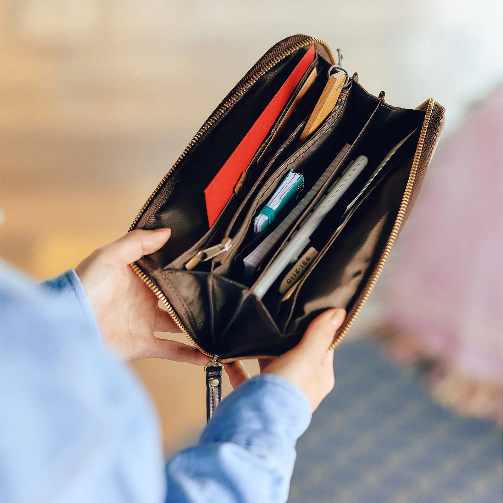 The Drawer Pouch Áne (AH-nay, “older sister” in Japanese) is the size of a wallet and opens accordion-style. The Áne works great as a wallet for your cards and bank books, but it’s also perfect for storing other smaller items, such as writing accessories, tickets, and headphones.
