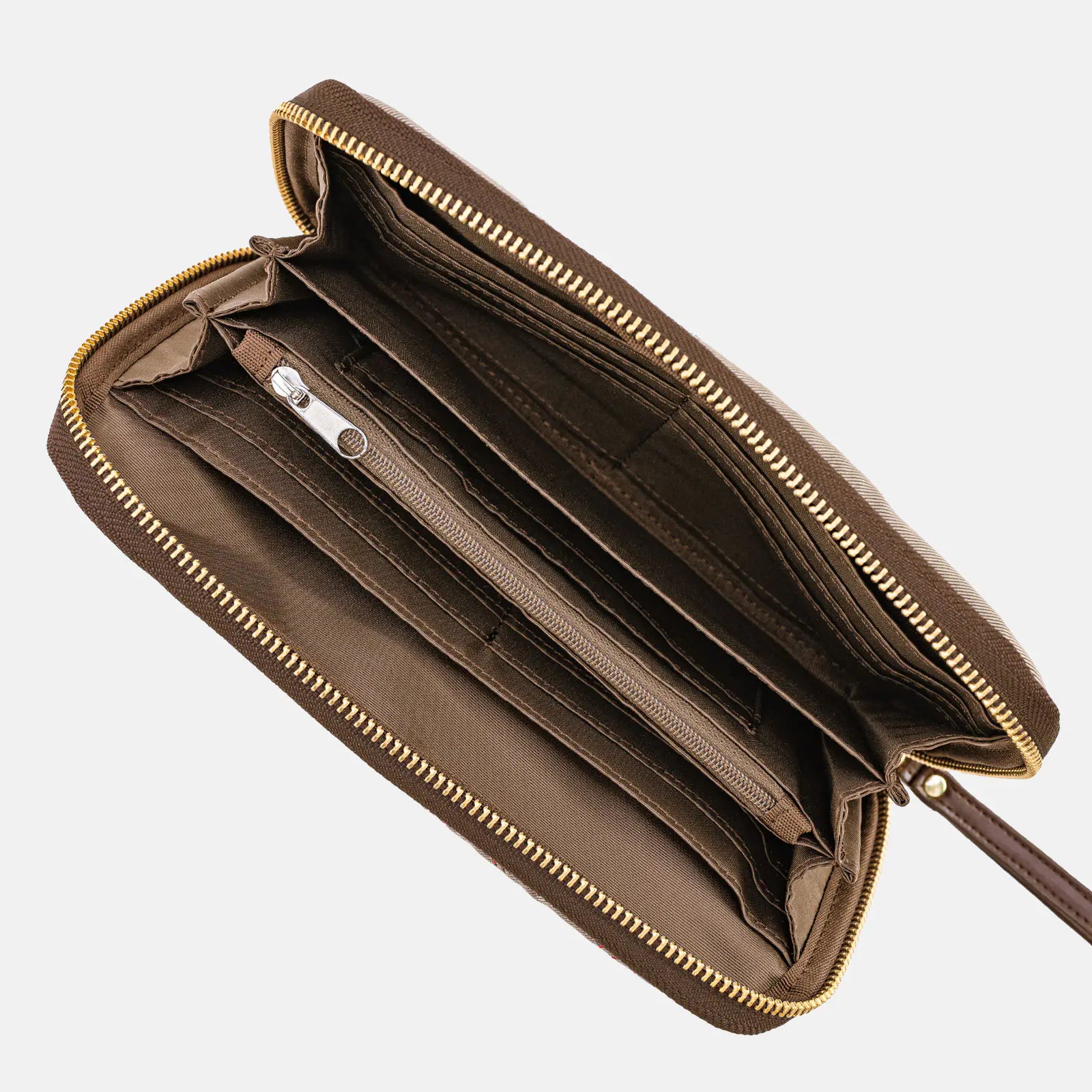 This Bow & Tie: Galloping Horses pouch is made with actual necktie fabric that has a pleasant textured feel and a beautiful sheen. The design features horses walking and galloping across a chic beige background, woven in fine detail using necktie weaving techniques. The interior is lined with a dark brown color to complement the design.