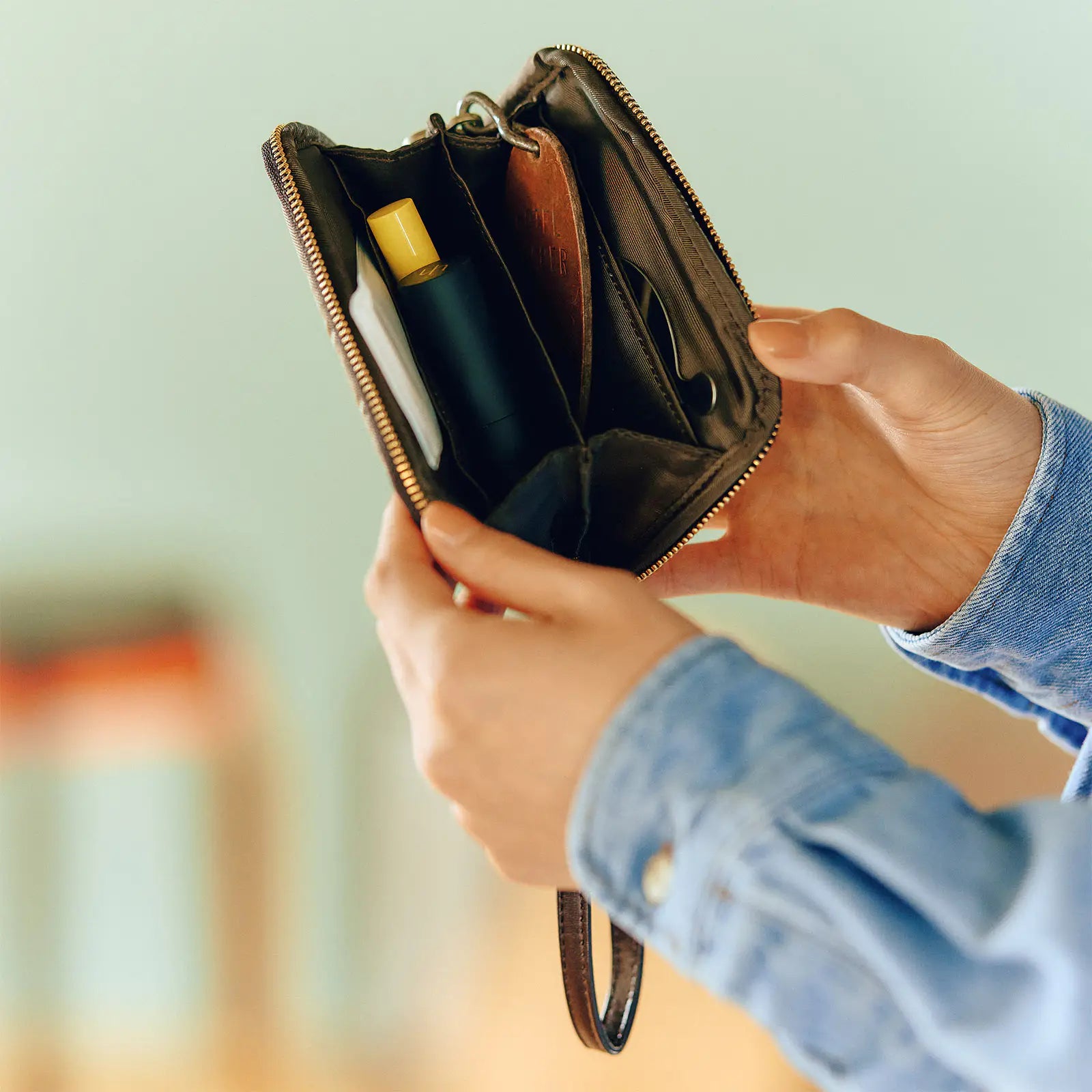 The pouch opens accordion-style and is the perfect size for storing cards. The interior is split into four zones to allow for detailed organization. While compact, the pouch also has enough storage space to hold items with volume, such as lip balm and earbuds.
