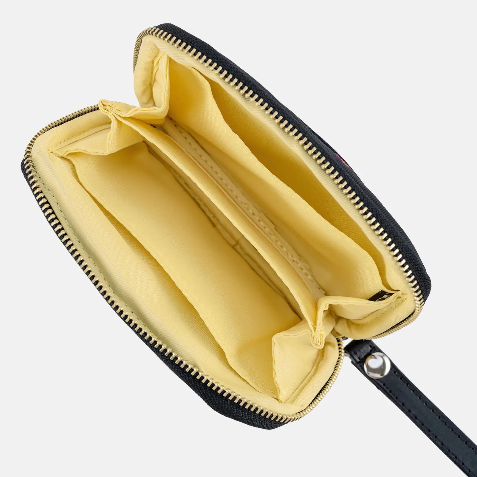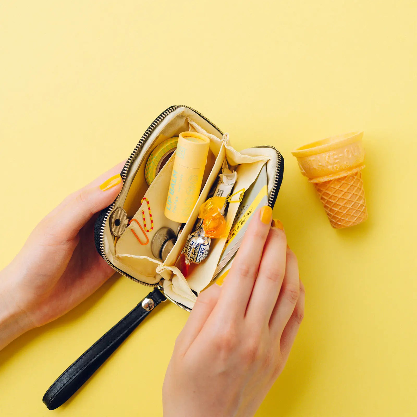 The pouch opens accordion-style and is the perfect size for storing cards. The interior is split into four zones to allow for detailed organization. While compact, the pouch also has enough storage space to hold items with volume, such as lip balm and earbuds.