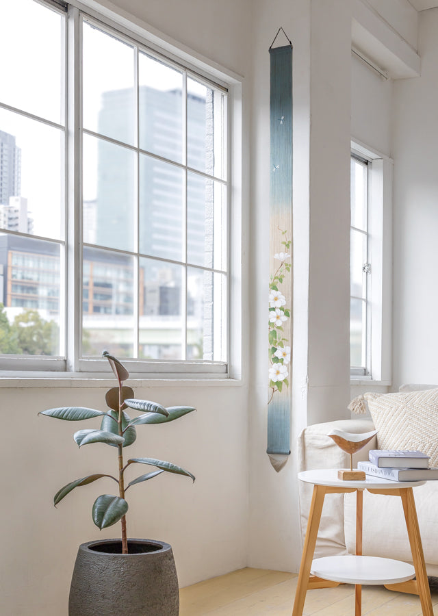 Hand-dyed Linen Japanese Narrow Tapestry - Clematis -, Kyoto Noren, Japanese wall hanging scroll