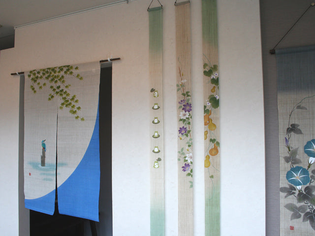 ■ Hand-dyed Linen Japanese Narrow Tapestry - Clematis Patens -, Kyoto Noren, Japanese wall hanging scroll