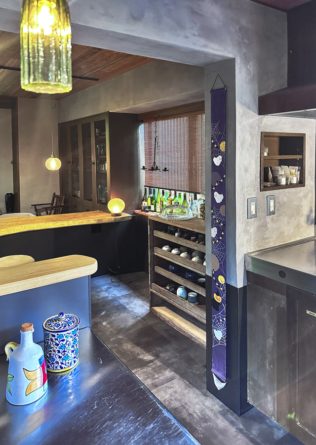 ■ Hand-dyed Linen Japanese Narrow Tapestry - Halloween Party -, Kyoto Noren, Japanese wall hanging scroll
