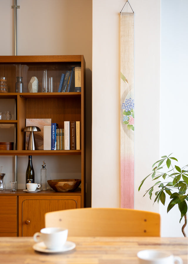 ■ Hand-dyed Linen Japanese Narrow Tapestry - Hydrangea -, Kyoto Noren, Japanese wall hanging scroll
