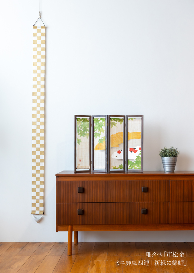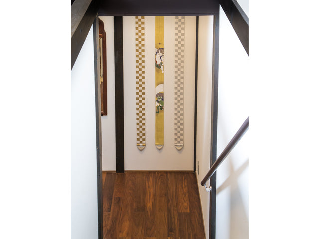 Hand-dyed Linen Japanese Narrow Tapestry - Japanese Check Pattern / Gold -, Kyoto Noren, Japanese wall hanging scroll
