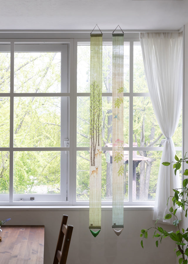 Hand-dyed Linen Japanese Narrow Tapestry - Red-Flanked Bluetail -, Kyoto Noren, Japanese wall hanging scroll