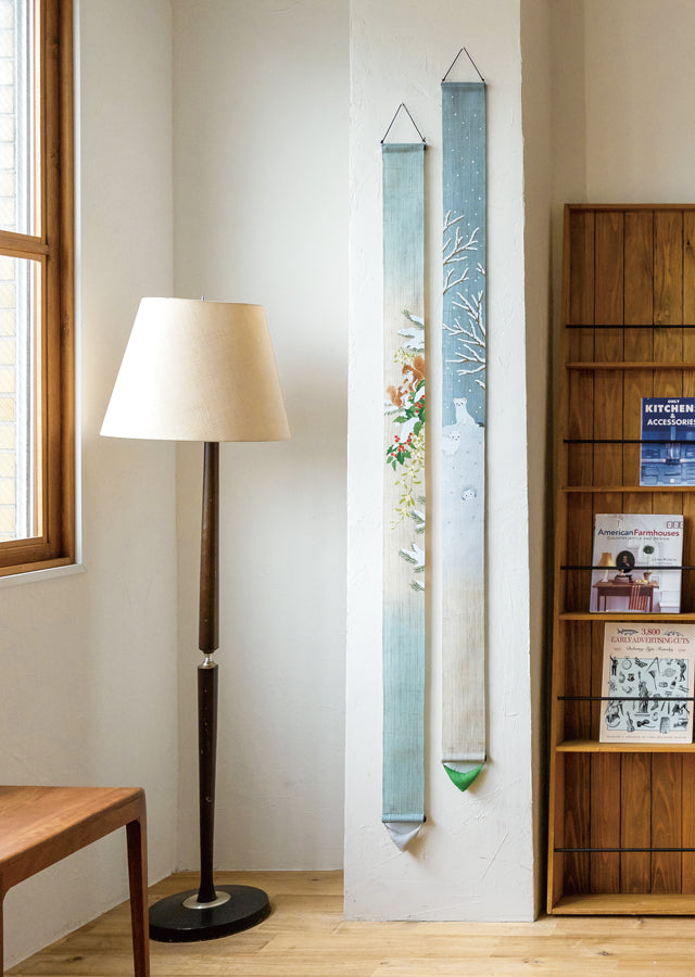 ■ Hand-dyed Linen Japanese Narrow Tapestry - Squirrel and Holly -, Kyoto Noren, Japanese wall hanging scroll