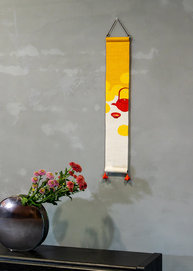 Hand-dyed Linen Japanese Small Tapestry - Kikuzake (Japanese chrysanthemum sake) -, Kyoto Noren, Japanese wall hanging scroll