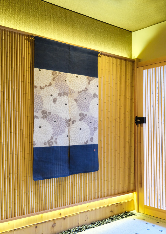 Hand-dyed Linen Noren (Japanese Doorway Curtain) - Chrysanthemum / Lapis Lazuli - , Kyoto Noren