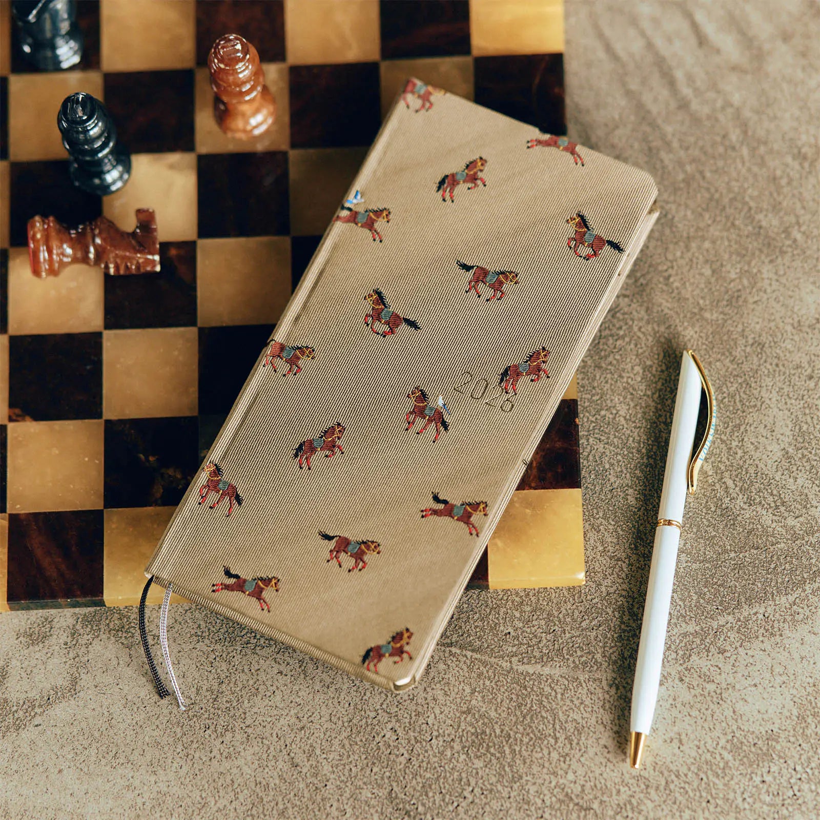 The Bow & Tie series is covered with the same textured, shiny fabric used in neckties. The material has a beautiful gloss and is soft to the touch. On this Galloping Horses cover, a variety of horses—some galloping, some walking—are woven into a chic beige background. The horses spending their time in leisure are depicted in fine detail through the intricate weave of necktie fabric.