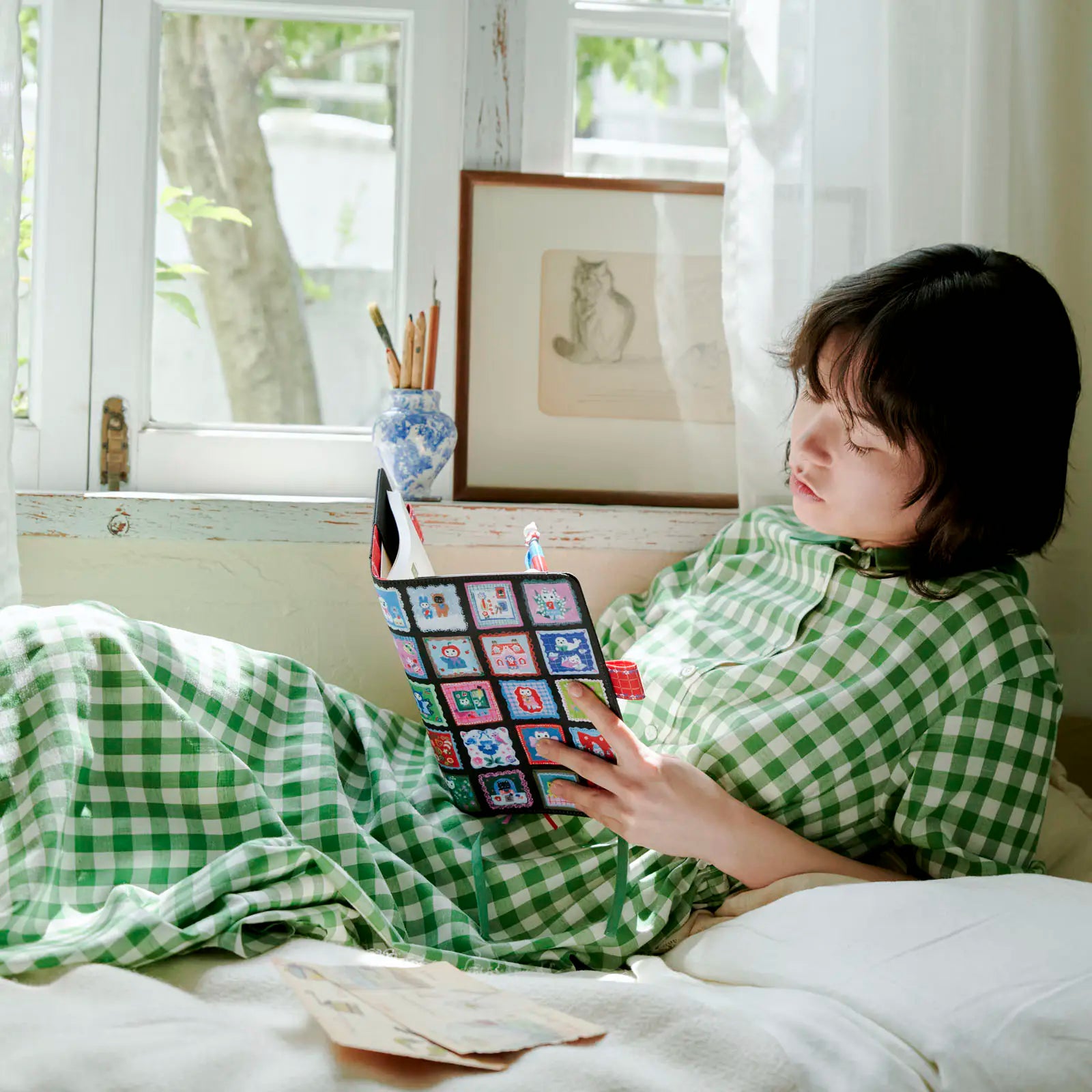 The world created by Kitagishi in acrylic gouache draws you in, quietly making you imagine the stories or settings behind each piece for a special kind of wonder. Both nostalgic and exciting, her illustrations perfectly capture the charm of a picture book. The theme for this techo cover is a “White Cat’s Daily Life,” and it is made out of a polyester material.