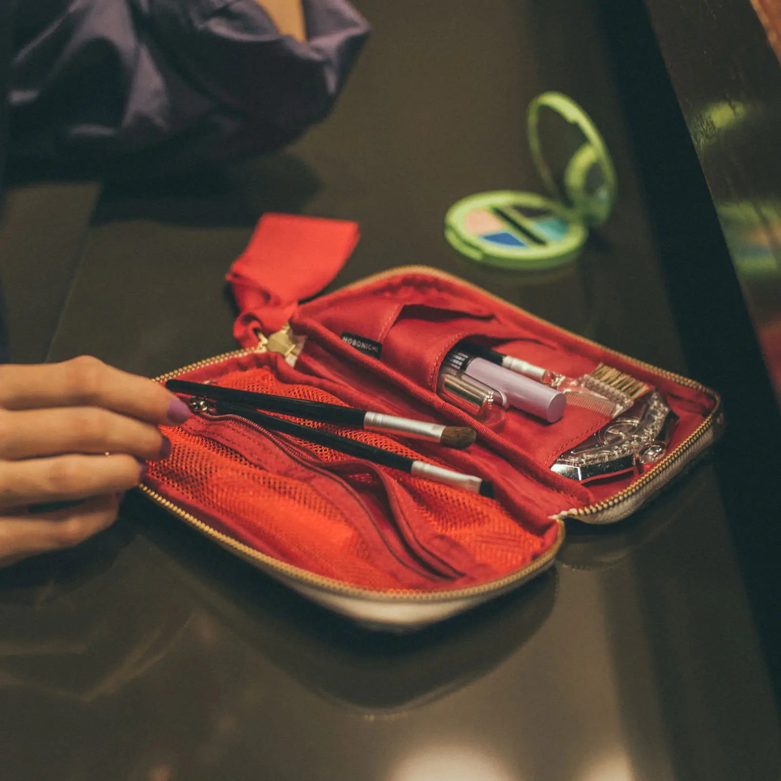 The pouch can lay open completely flat when it’s unzipped, making it easy to glance inside and grab what you need.