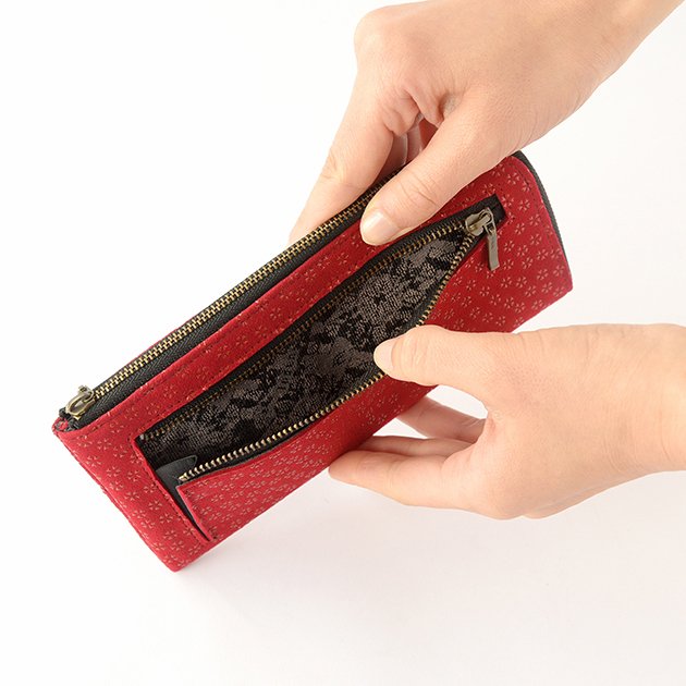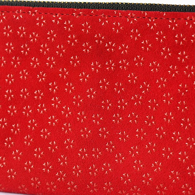 Koshu Inden Japanese Deerskin Leather with Urushi (Japanese Lacquer) L-Zip Long Wallet - Cherry Blossom / Red - , Made in Japan, Japanese Leather Wallet