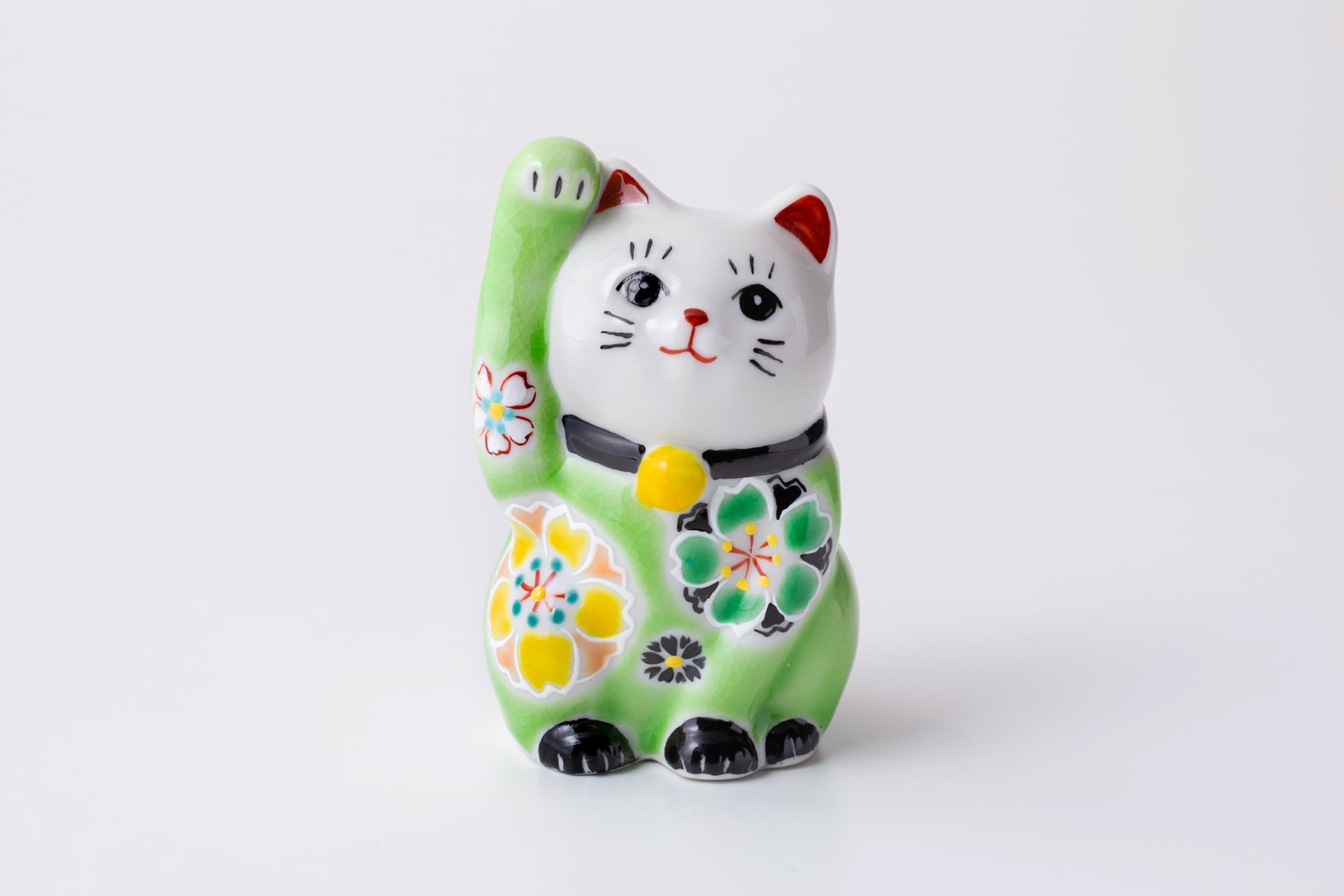 Kutani Yaki(ware) Japanese Maneki-Neko (Beckoning Cat) Figure - Cherry Blossom / Green -, Japanese lucky cat figure