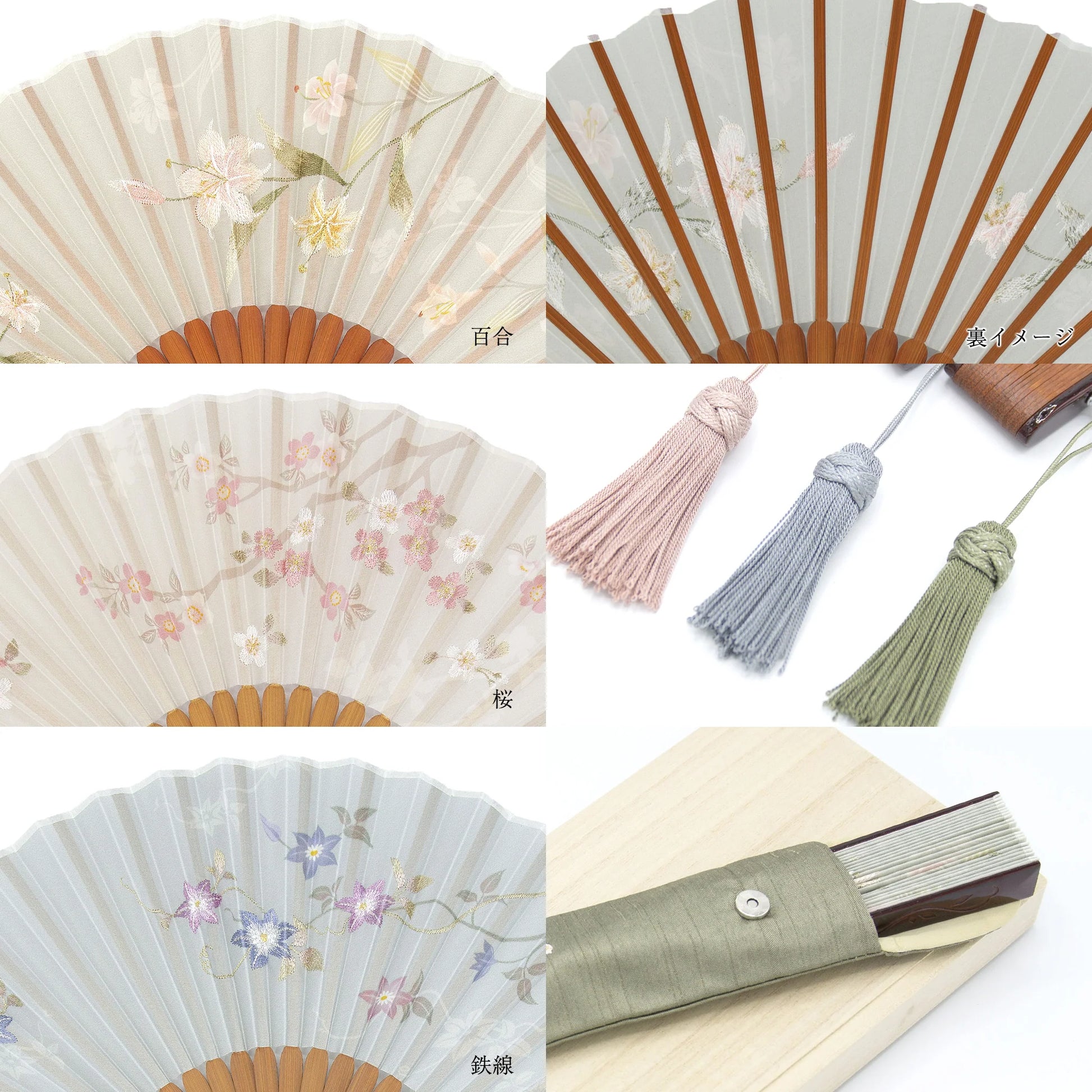 This fan is made of luxurious silk fabric in muted colors and features delicate floral embroidery.