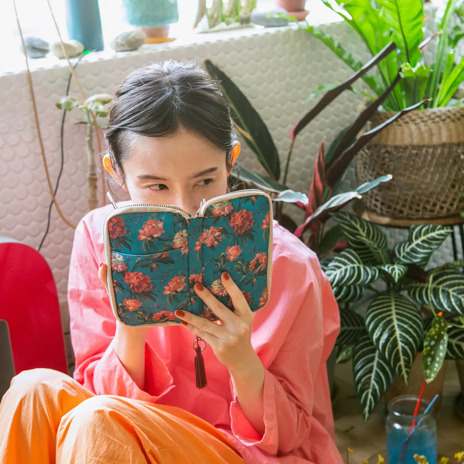Decadent Blooms features a textile from Liberty Fabrics, which has fans all over the world. The dusky turquoise is printed with big peonies, roses, and forget-me-nots for a gorgeous, exotic look. The cover interior is beige, and the zipper pull includes a dark red tassel.