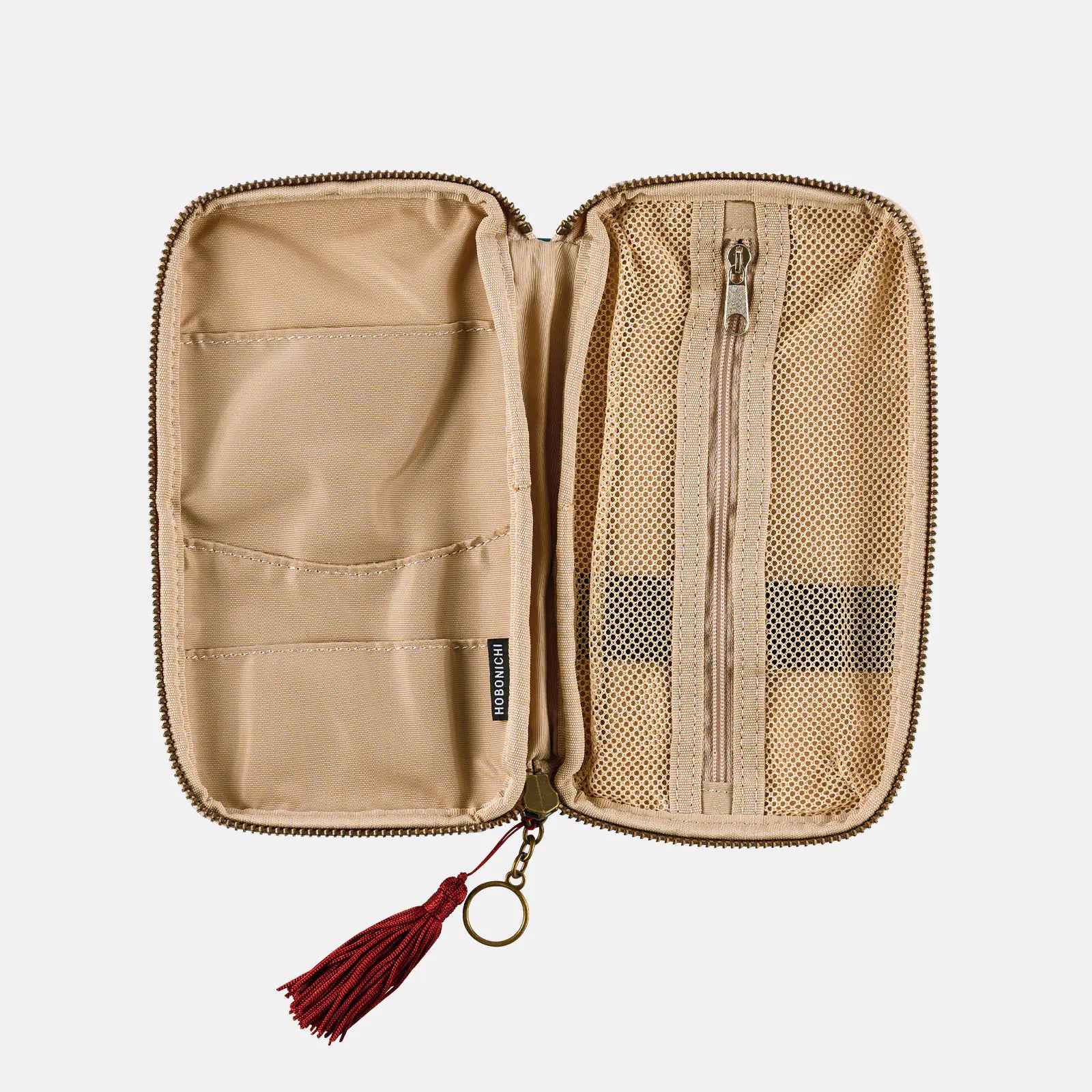 On the right side of the interior is an expandable mesh pocket that can hold items with more shape, such as pens, washi tape, charging cables, and more. Inside this pocket is a band that can hold a pens.