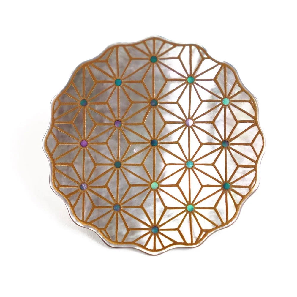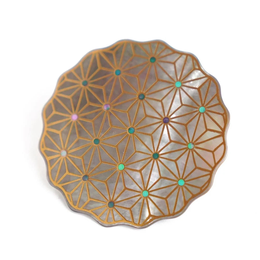 This listing is for a beautiful Maki-e Urushi Lacquer Brooch - Black Lip Oyster Pearl Shell / Geometric Hemp-Leaf Pattern -.