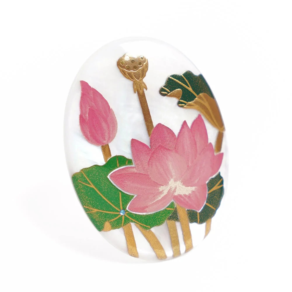 Maki-e Urushi Lacquer Brooch - White South Sea Pearl Shell / Lotus -, Traditional Japanese Urushi Lacquer Jewelry