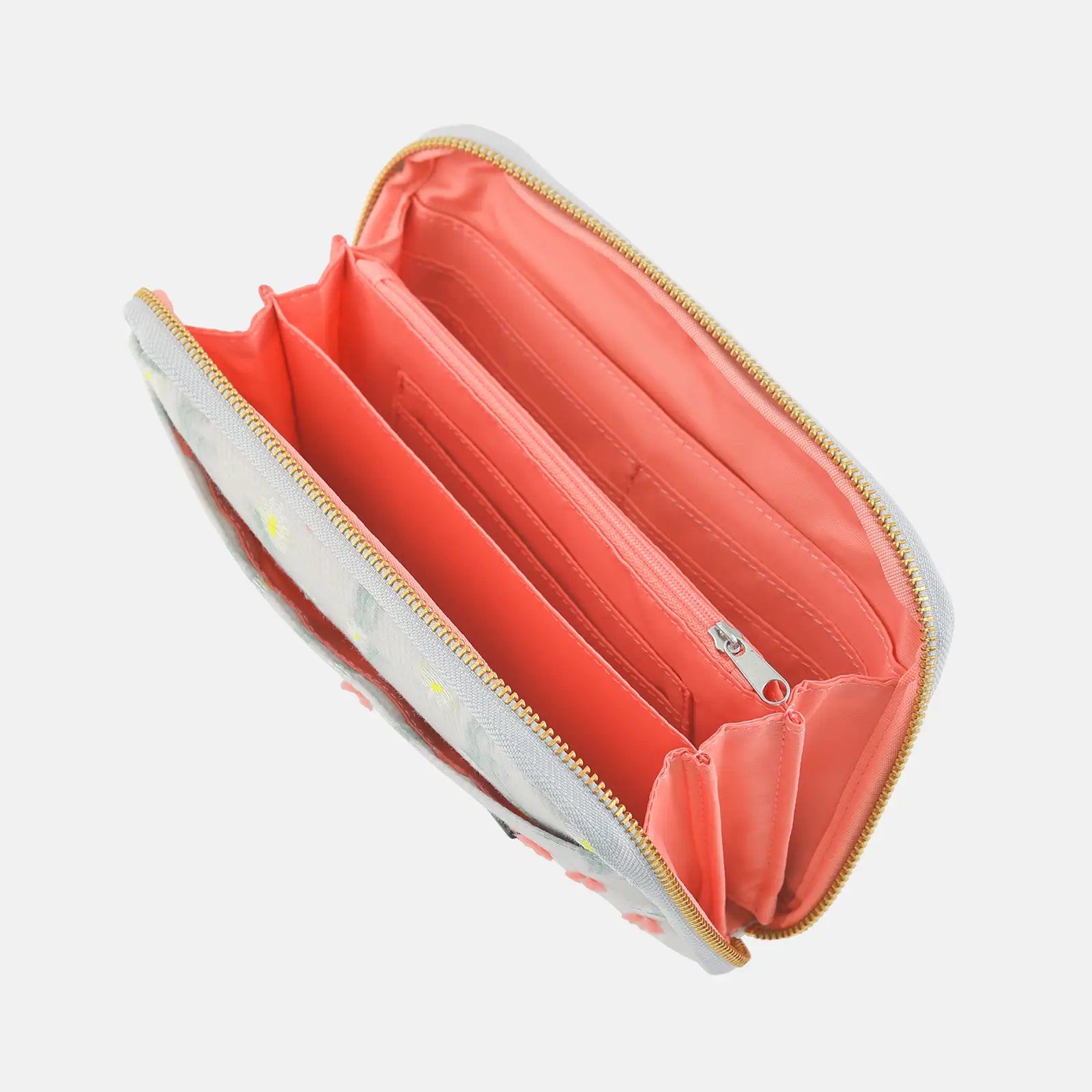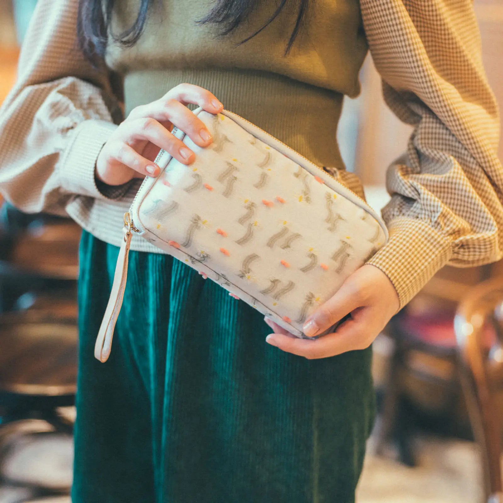 The Dreaming Garden textile from Makino Collection overlays white flowers against a light gray base material. Embroidered areas around the flower stems are done in a green so light that it looks like an afterimage effect on this dreamy design. Fluffy salmon-pink threads around the flowers and stems were woven into the textile at the time of production. These complex textures were created in Kiryu City, Gunma Prefecture. The entire process is laborious, from start to finish—before washing the textile, all the excess threads were trimmed. The interior is salmon pink, and the zipper pull is natural leather.