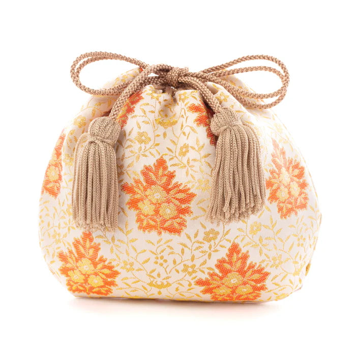 This listing is for a Nishijin-ori Small Drawstring Bag - Flower and Arabesque Pattern / White -.