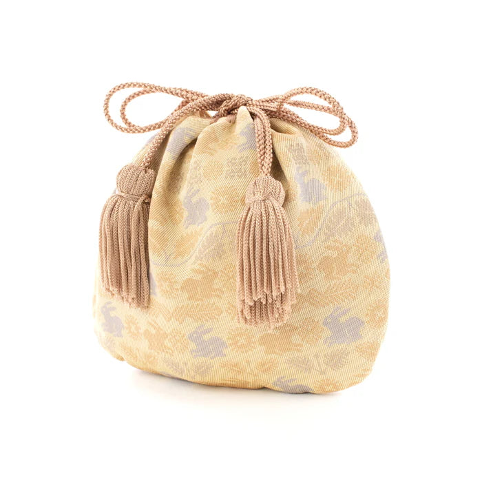 This listing is for a Nishijin-ori Small Drawstring Bag - Flower and Rabbit / Cream Yellow -.