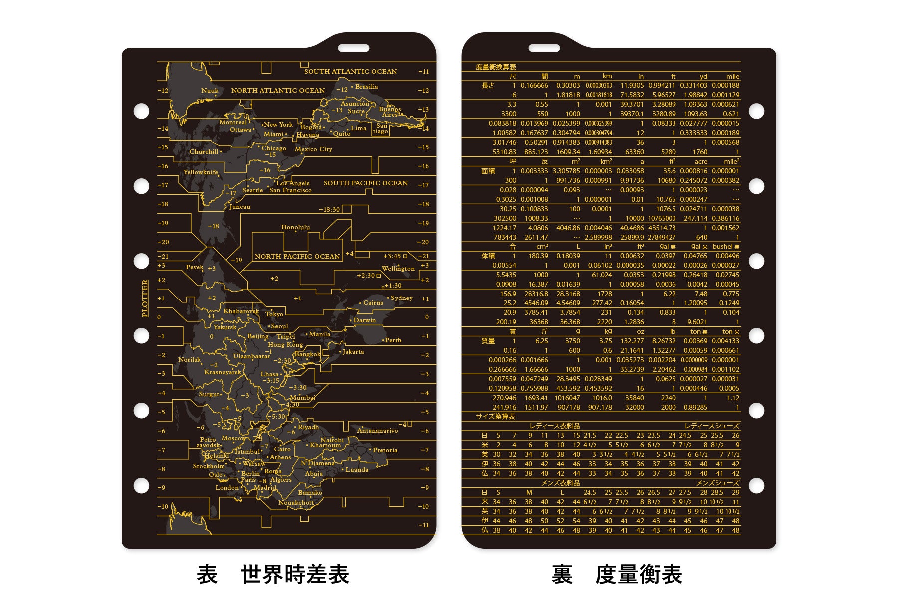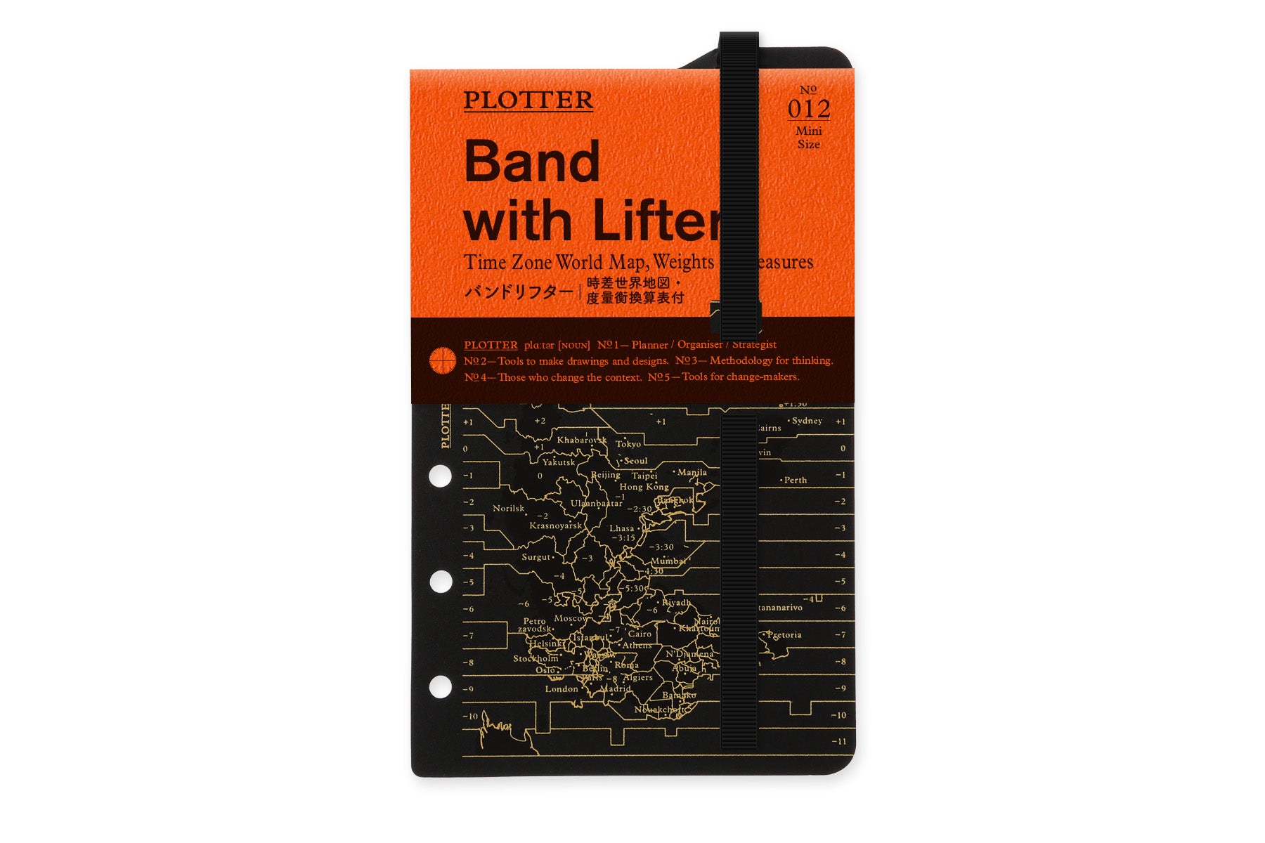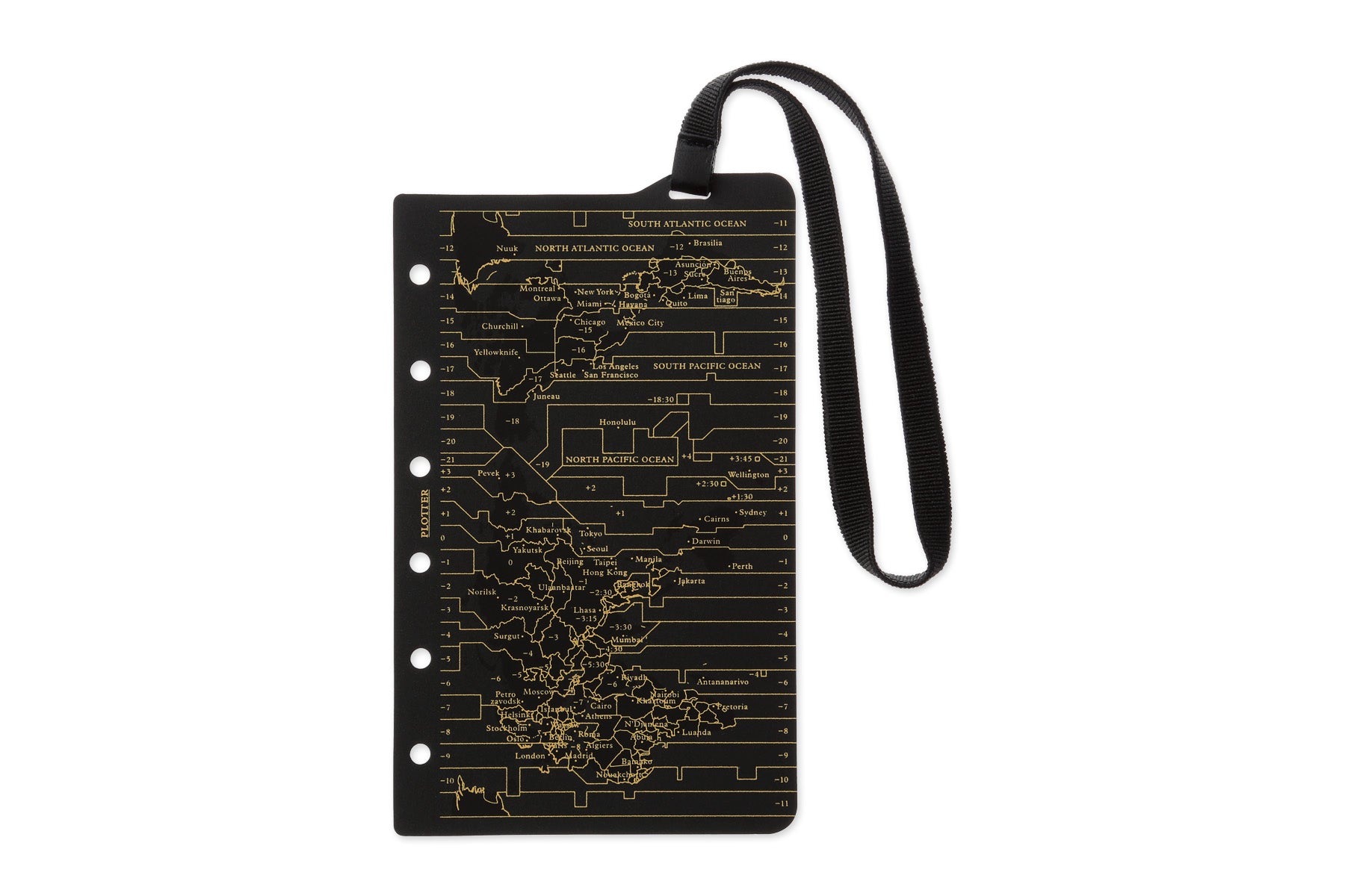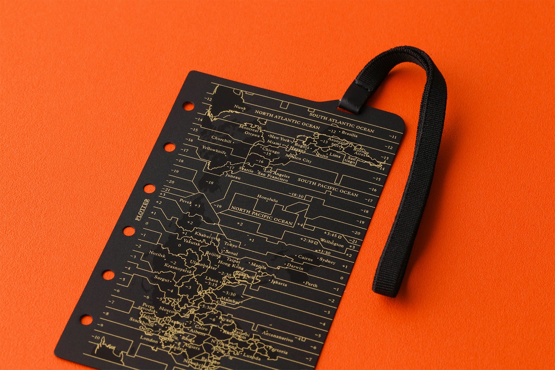 A lifter with an elastic band that securely holds the Leather Binder close. The Lifter is designed with the world map, time difference table, and other conversion metrics, all screen printed in matte gold by hand. Enjoy the combination of functionality and design to invigorate your creative flow.