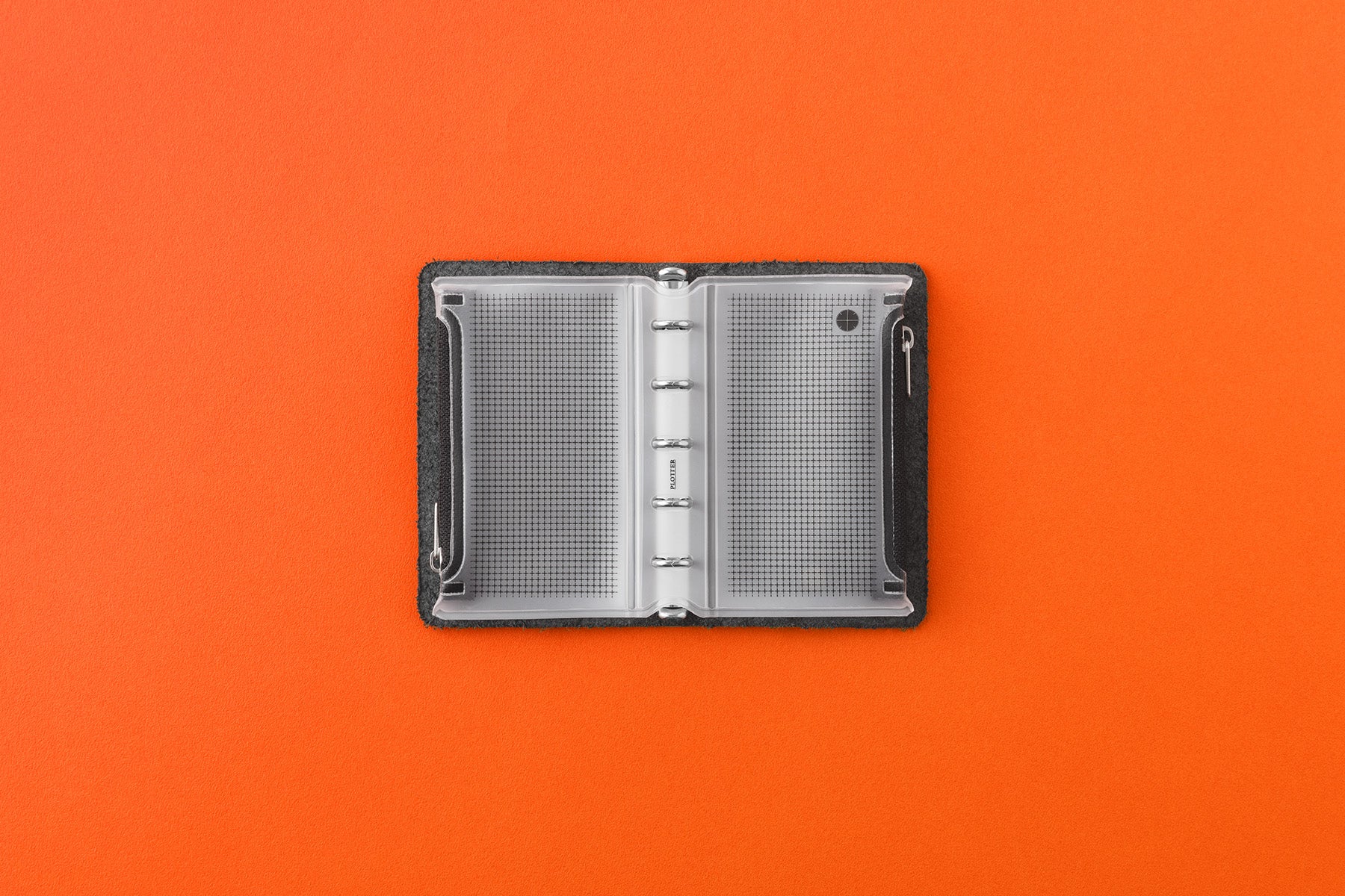The fastener case can be attached to the leather binder outside the ring fixture, just like a ring supporter. This design preserves the refill capacity of the ring binder and doesn’t compromise on valuable ring space.