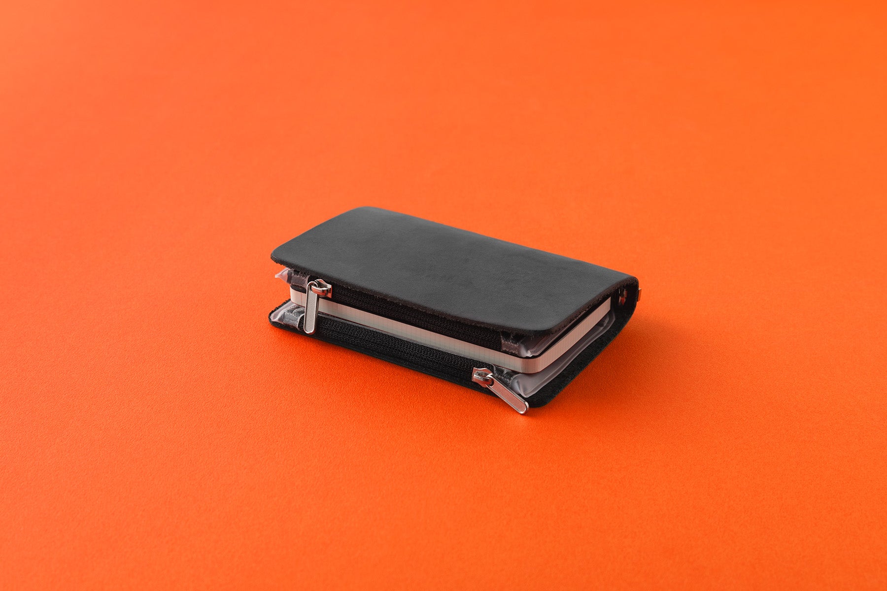 The clever positioning of the fastener zippers on opposite ends allows the leather binder to close evenly without any awkward bulkiness. The zippers also do not get in the way of existing refills and accessories, while maintaining a seamless and clean look.