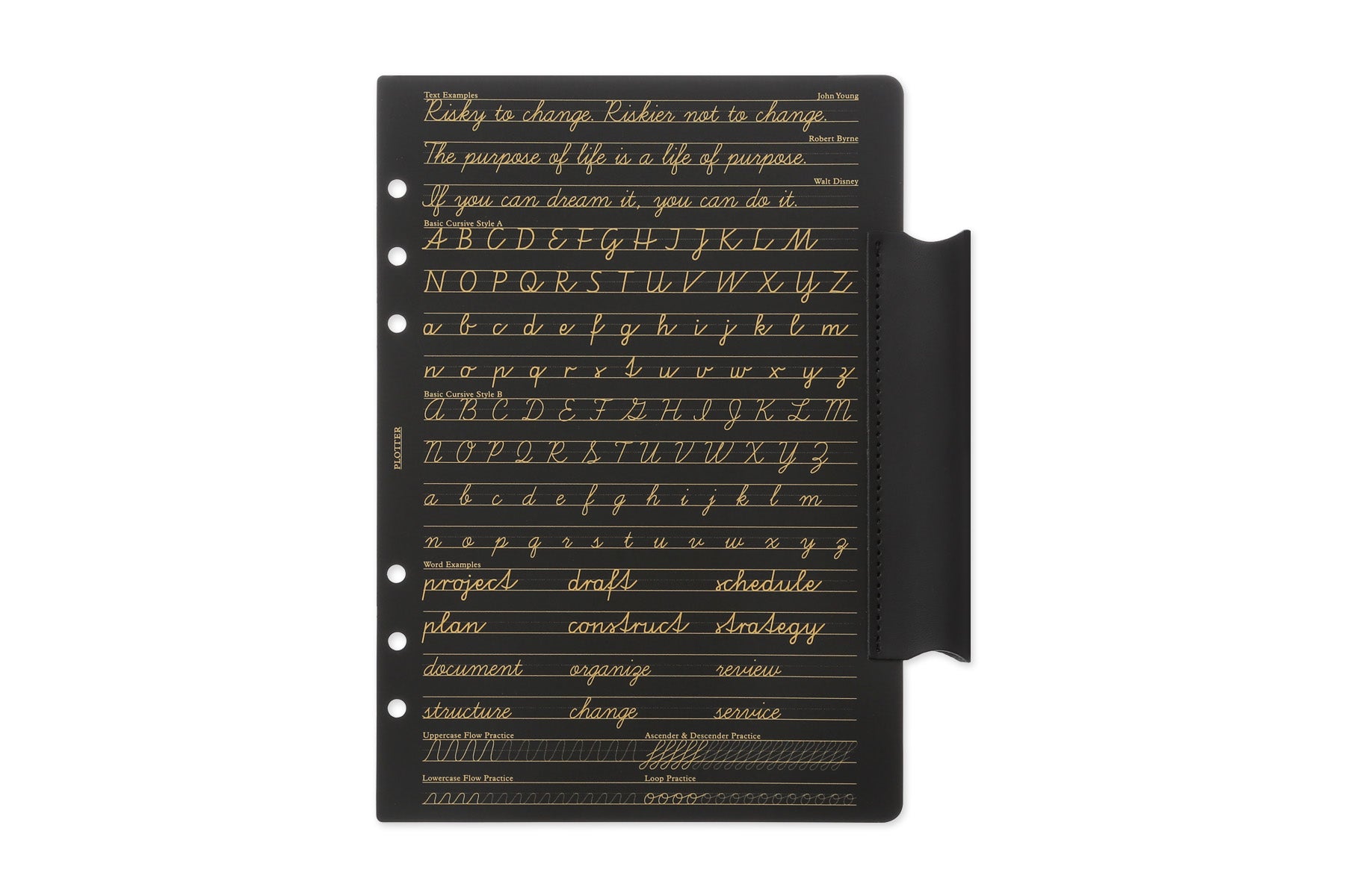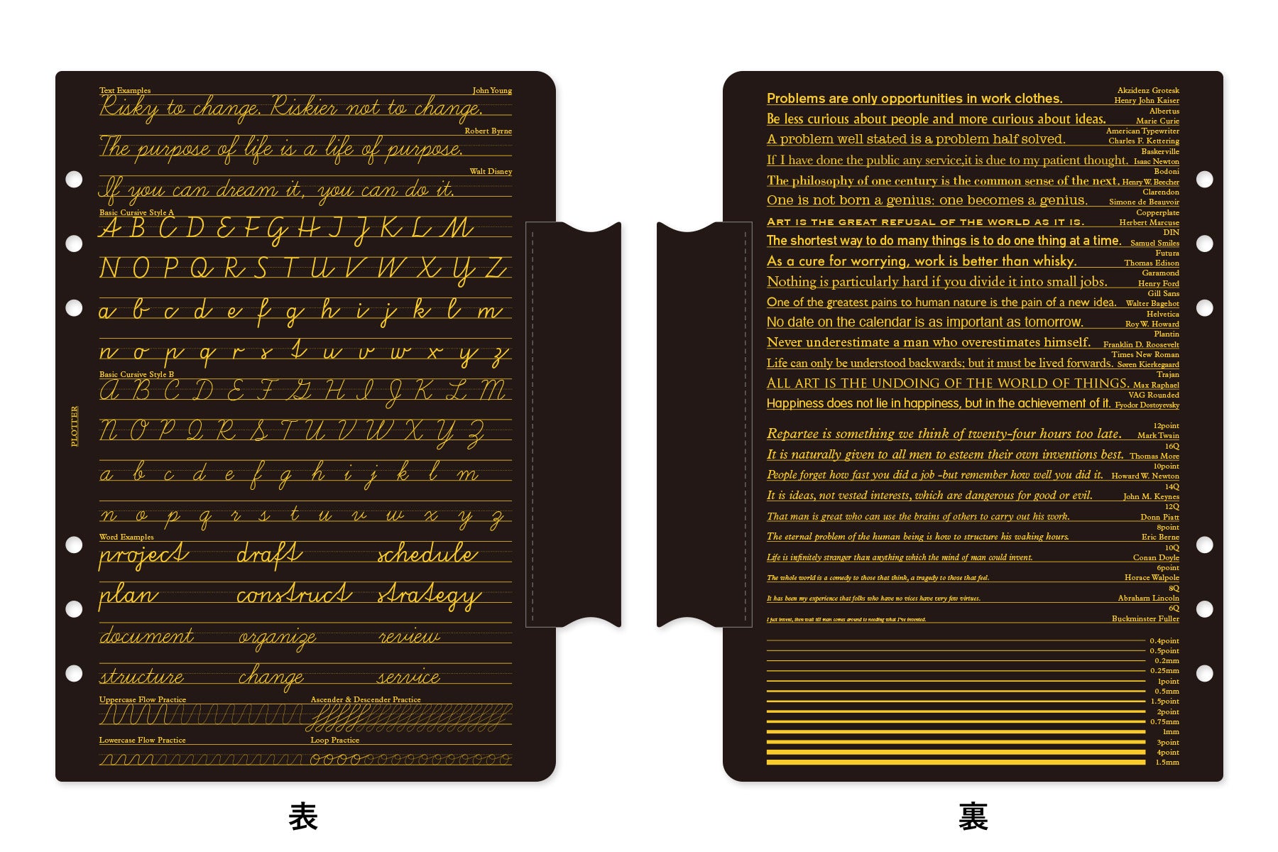 A Lifter with a full-size genuine leather pen holder that securely holds the entire pen. The Lifter is designed with a variety of fonts and calligraphy designs with quotes from famous people to inspire creative writing, all screen printed in matte gold by hand. This multifunctional pen holder also comes with a line width chart. You can protect the refills from the contours of the leather covers by placing Lifters at the beginning and end of the Leather Binder.