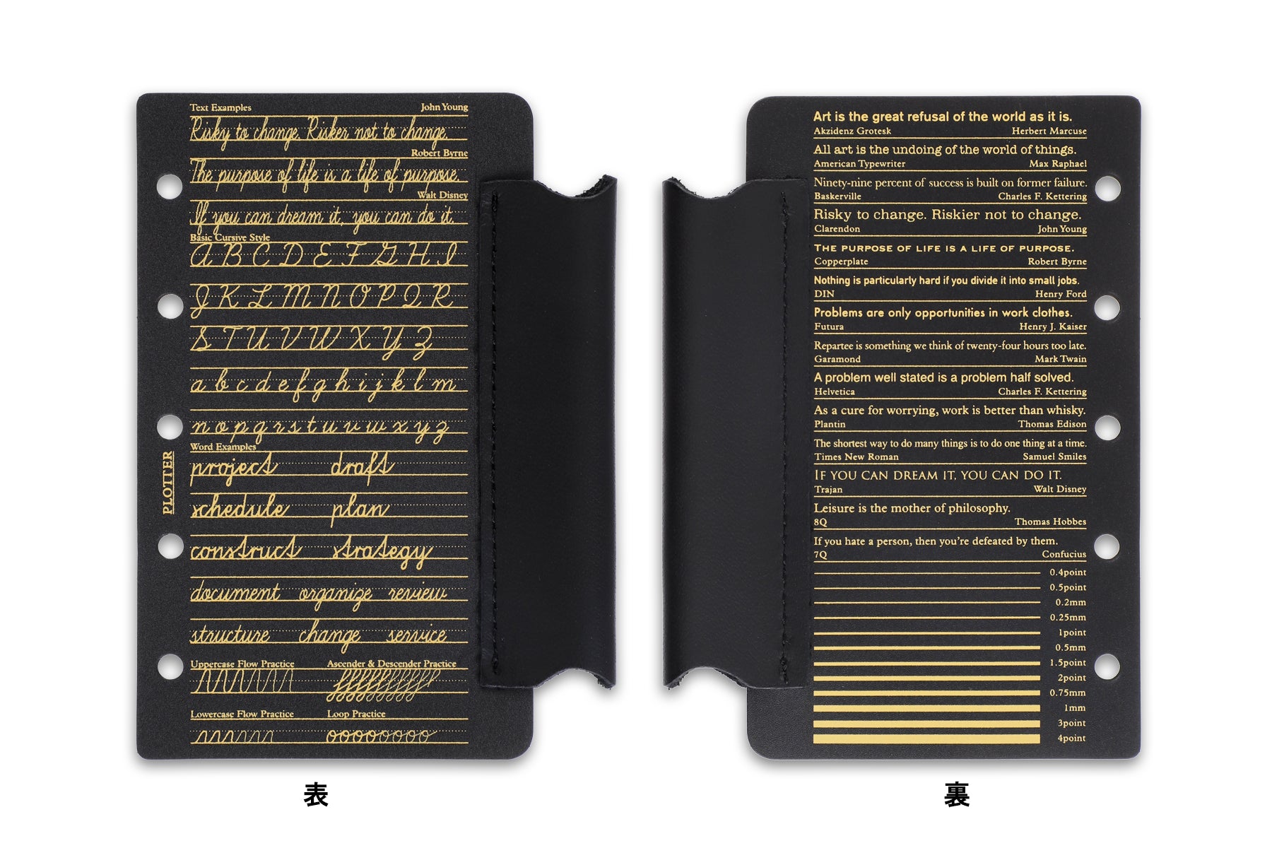 A Lifter with a full-size leather pen holder that securely holds the entire pen. The Lifter is designed with a variety of fonts and calligraphy designs with quotes from famous people to inspire creative writing, all screen printed in matte gold by hand. This multifunctional pen holder also comes with a line width chart. You can protect the refills from the contours of the leather covers by placing Lifters at the beginning and end of the Leather Binder.