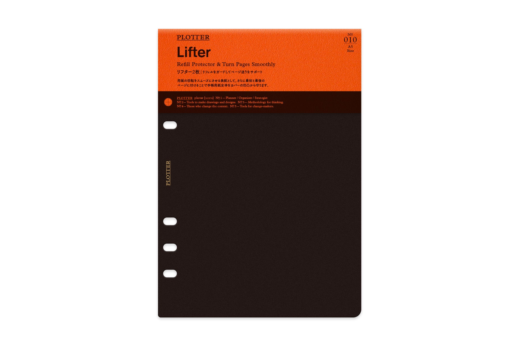 Lifters can protect the refills from the contours of the leather covers simply by placing them at the beginning and end of the Leather Binder. You can also use it as dividers between pages to easily access the section you need. Lifters can also be used as pencil boards because of their smooth and sturdy surface. PLOTTER logo is screen printed in matte gold on each Lifter.