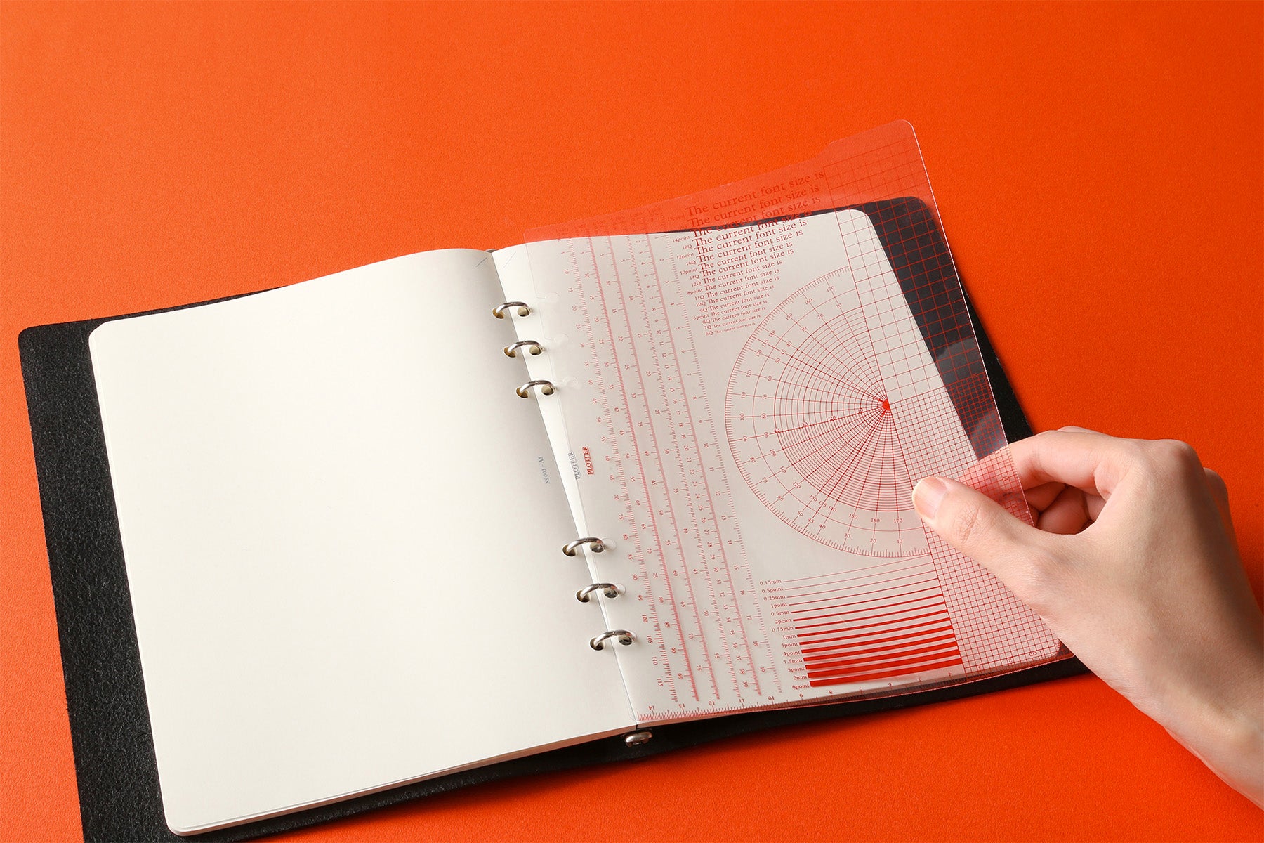 The Ruler Pad is a scale ruler, protractor, character size reference, line width chart, and grid templates all-in-one. The upper right corner has a protrusion that is designed to be an index tab so you can quickly access the page you need even after closing the ring leather binder. The keyhole ring design makes it easy to remove and reposition wherever you like. Enjoy a wide variety of scales and line width guides to assist your creative work.