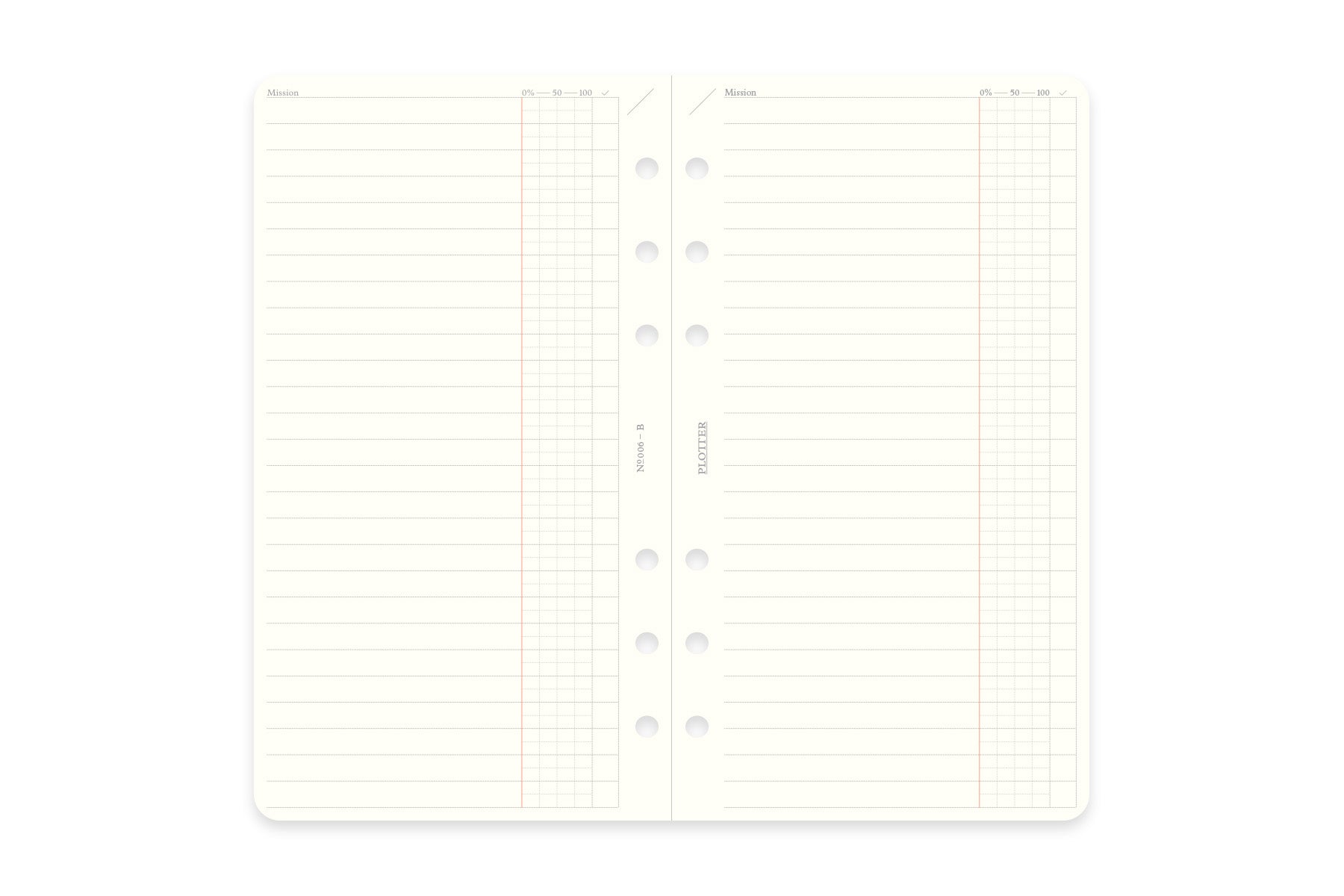 A simple to-do list designed for task management at a glance. Keep tabs on your tasks by utilizing the progress bar with four levels of completion. Visualization of your progress helps you keep track of your priorities. The Refill Memo Pad is made of PLOTTER original refill paper that is thin but strong and tear-resistant. You can enjoy a variety of writing tools such as pens or fountain pen inks on this paper without feathering and bleed-through.