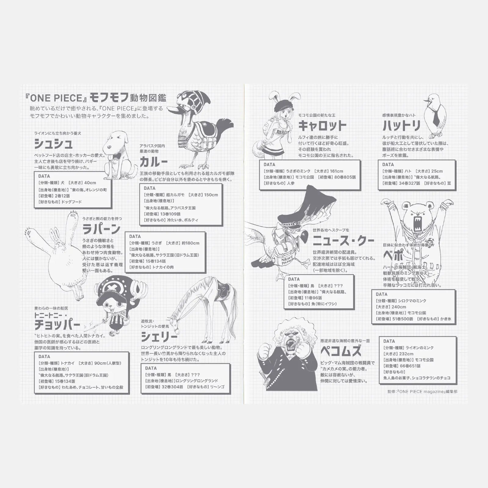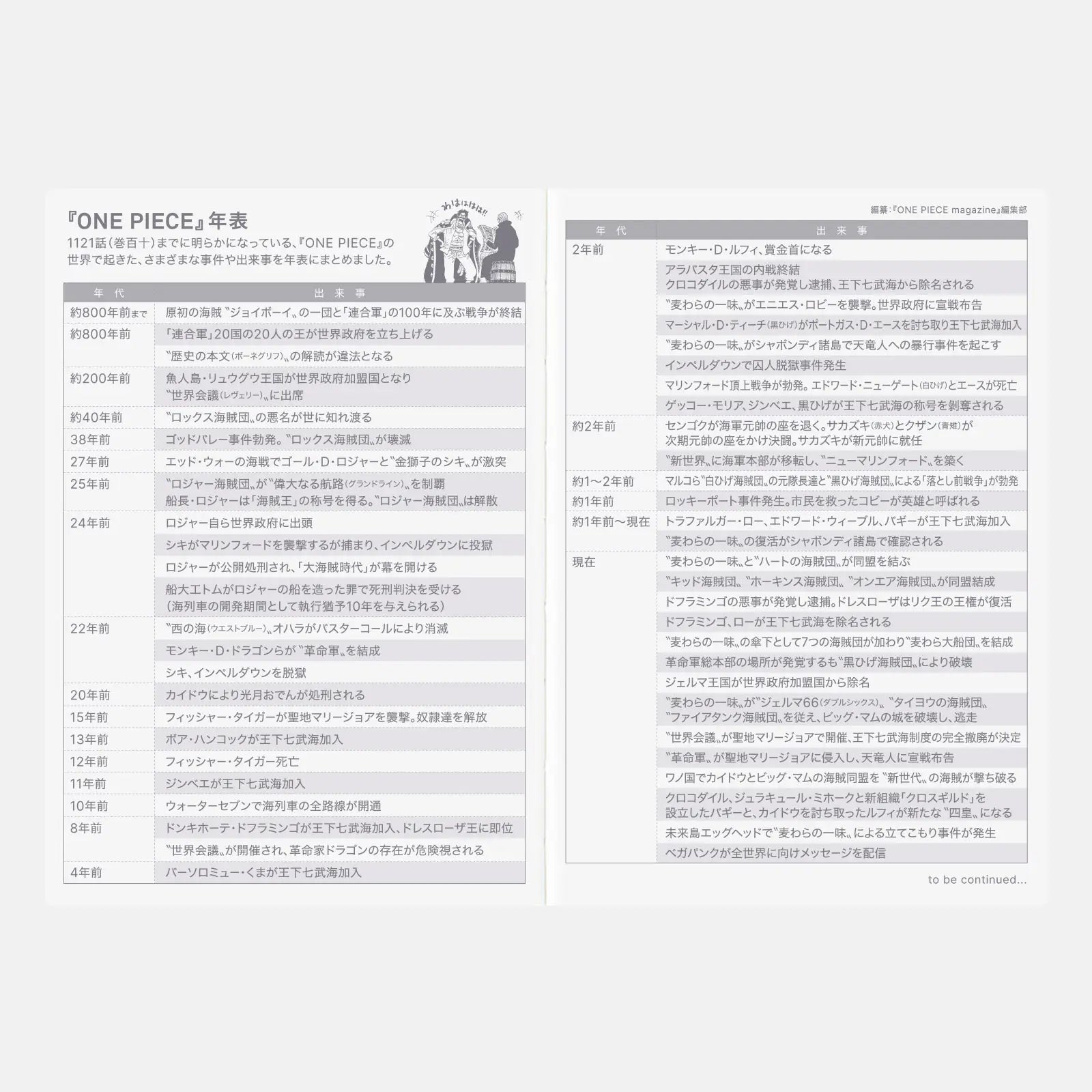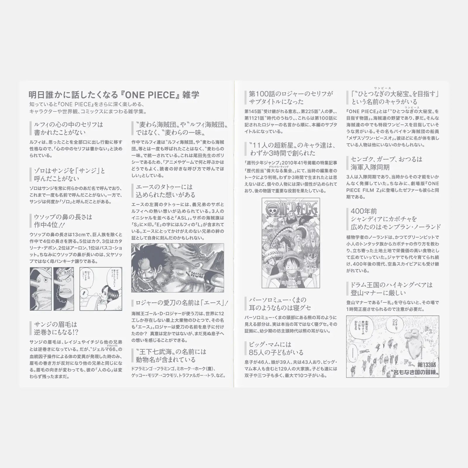 Bonus Pages One Piece Chronology / One Piece Trivia You’ll Want to Share Tomorrow / The Fluffy Animal Encyclopedia of One Piece / WANTED / Time Table / Favorites / My 100 / Solar Terms / Emergency Preparedness / Gifts / Age Table / Addresses / Personal Notes