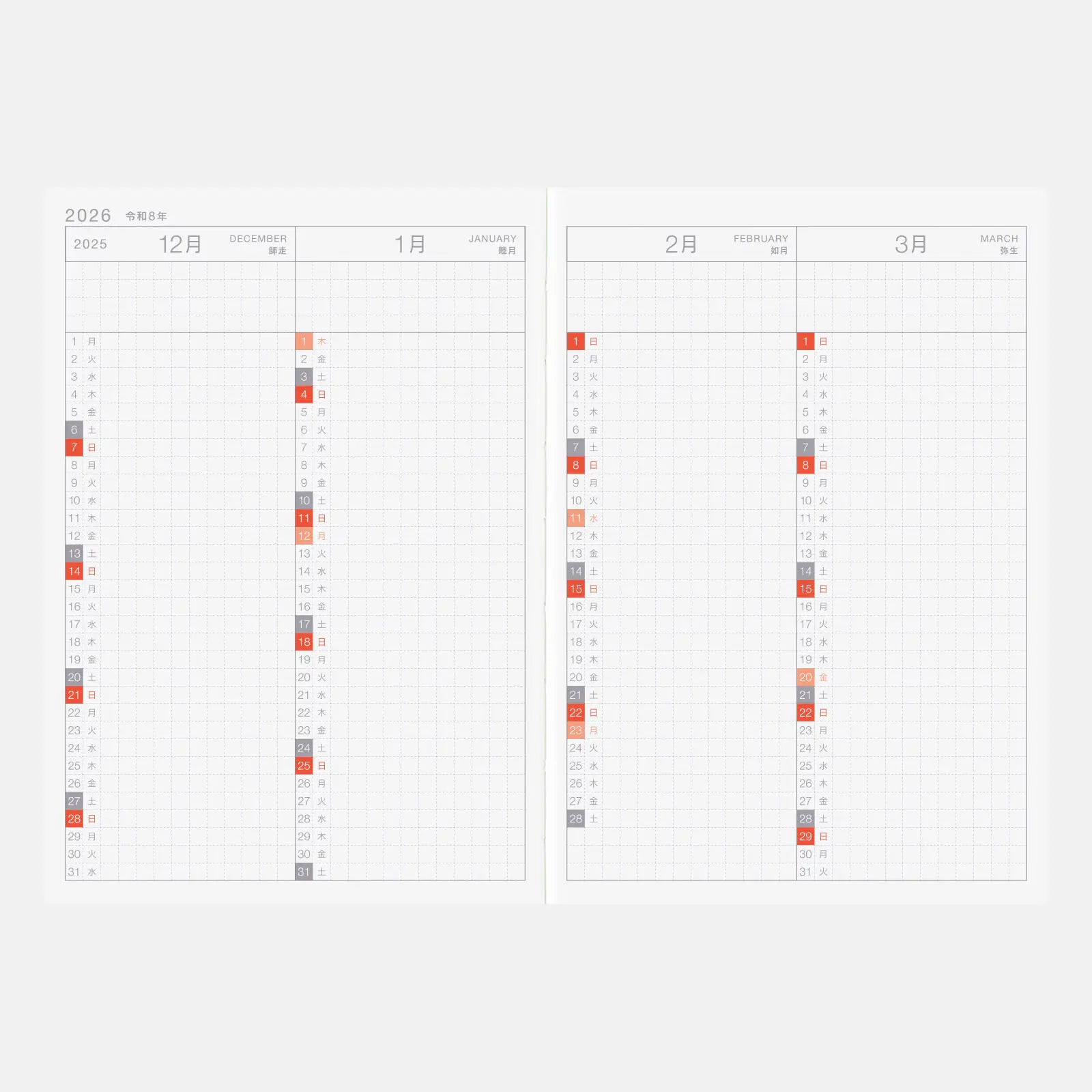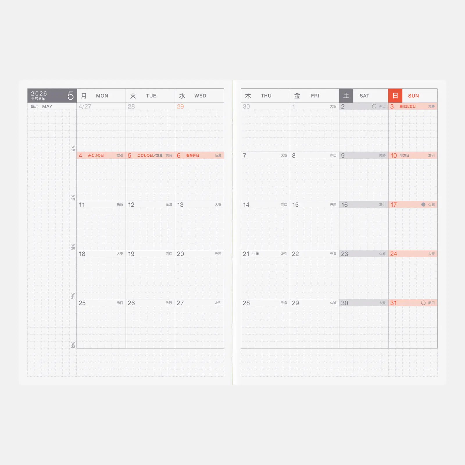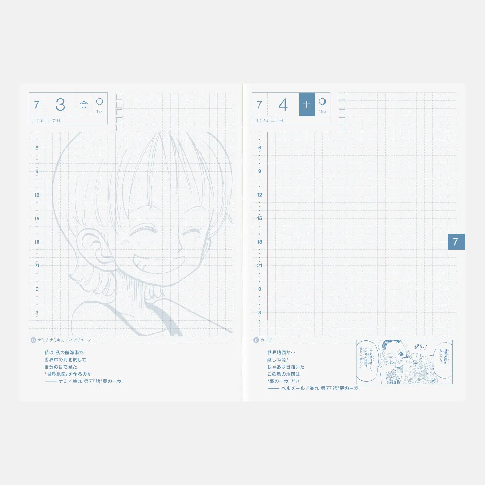 The cover is red in the image of the protagonist Monkey D. Luffy, and designed with an illustration depicting him, as well as the logo of the ONE PIECE magazine. The book’s lay-flat binding and thin and light Tomoe River graph paper with 3.7 mm squares make the book easy to read and write in. The book includes a yearly calendar, yearly index, Monday-start monthly calendars, daily pages, blank memo pages and more.