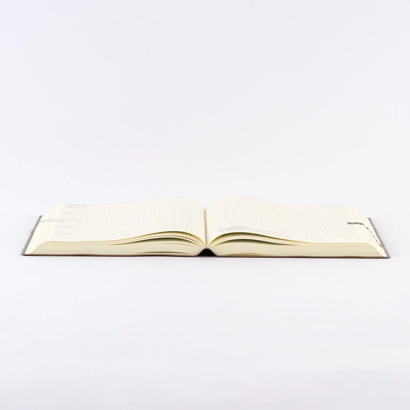 The book has the same thread-stitch binding as a dictionary, allowing it to lay flat open for comfortable writing. It stays flat even if you don’t hold it down.