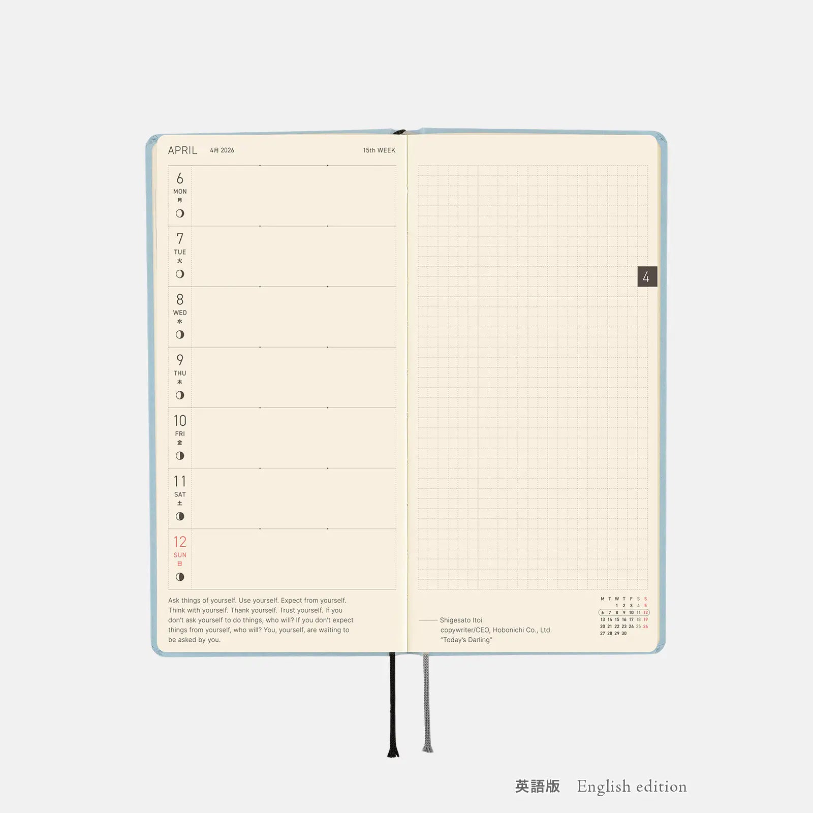 This listing is for a Hobonichi Techo 2026 Paper Series: Sky Weeks Hardcover Book / Weekly Horizontal / Jan start / Mon start - English Edition.