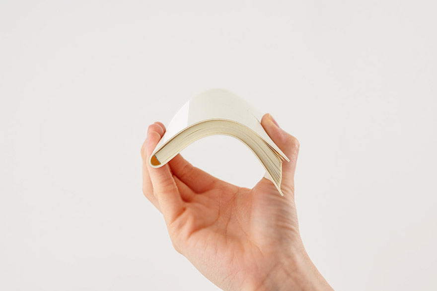 The book uses thin and light yet durable Tomoe River paper. It's characterized by its ability to hold ink well and provide a smooth writing experience.