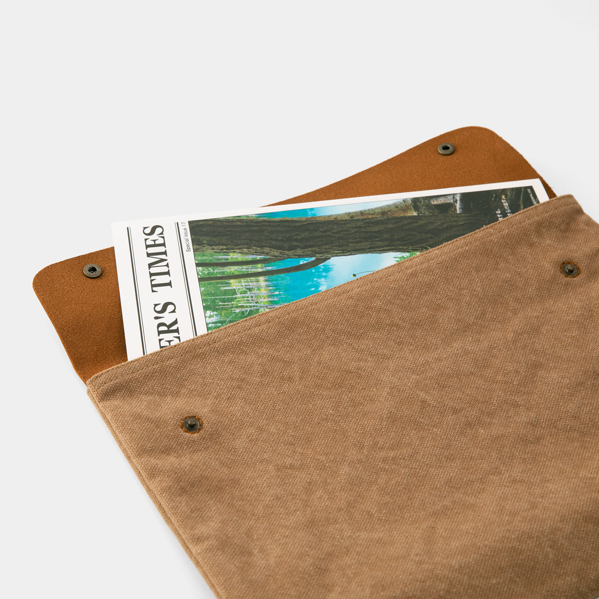The TRAVELER’S FACTORY Original Canvas Pouch is made of canvas fabric and evokes the natural feeling of handmade craft in Chiang Mai, Thailand. The pouch comes with two pockets – one with a front leather flap and a zippered pocket in the back for valuables.