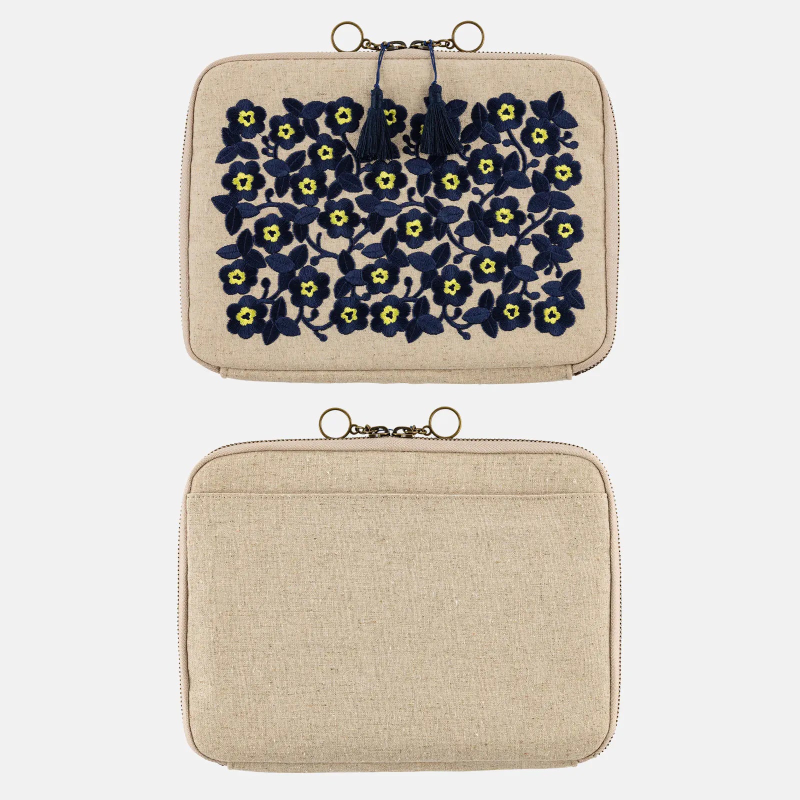 This Drawer Pouch features the design Ukrainian Flowers, which was a big hit when it was released as a techo cover. The design is based on the beautiful embroidery of traditional Ukrainian clothing, sorochka. Simple linen material is embroidered with navy and neon yellow threads. The interior is beige, and the zipper includes a navy tassel to match the floral embroidery.