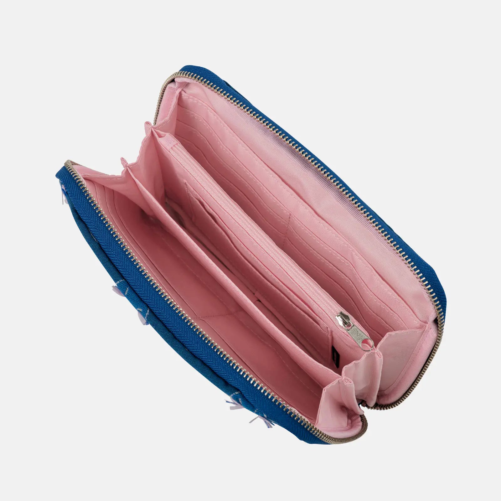 Whisker Cat places stitched images of cute cats and wavy lines against a deep blue background. The cats’ whiskers are made with white, pink, and light blue threads that have been cut one by one to the perfect length so you can enjoy the feel of the 3D effect against your fingertips. Look closely and you’ll see the faces of the cats vary, including some with wide eyes and some with narrowed eyes. The interior has a lustrous pink material to provide a charming contrast against the blue every time you open the pouch.
