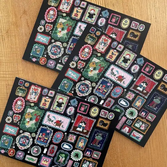 Beautiful harmony of colors and hand-drawing style are strikingly attractive on her artworks. She often draws lovely characters like cats, owls, rabbits, girls with bobbed hair, men with mustaches etc… One sheet of illustration has plenty of stories from her imaginative world, and it looks just like a picture book.