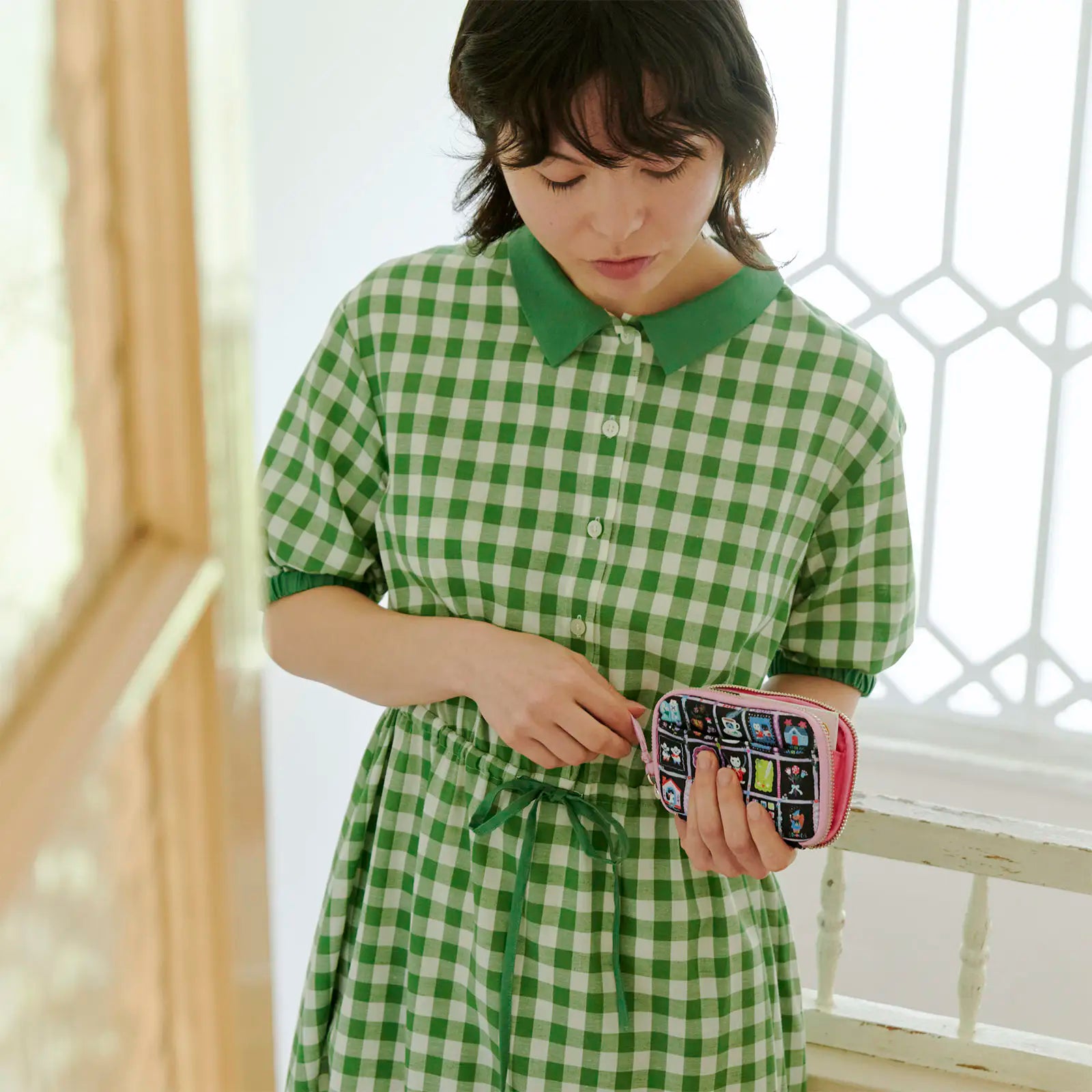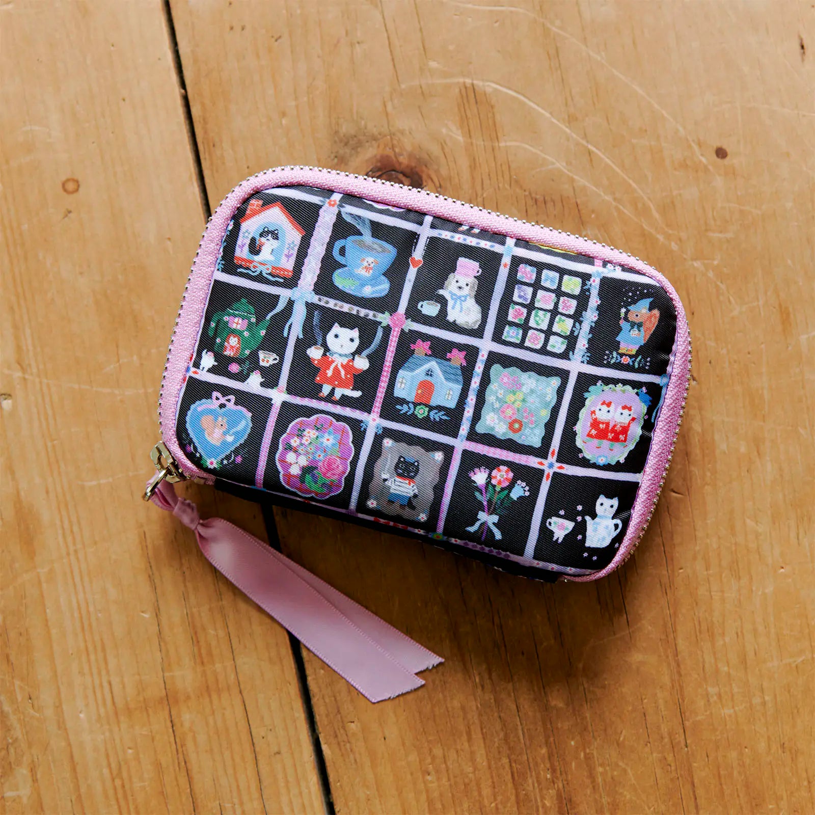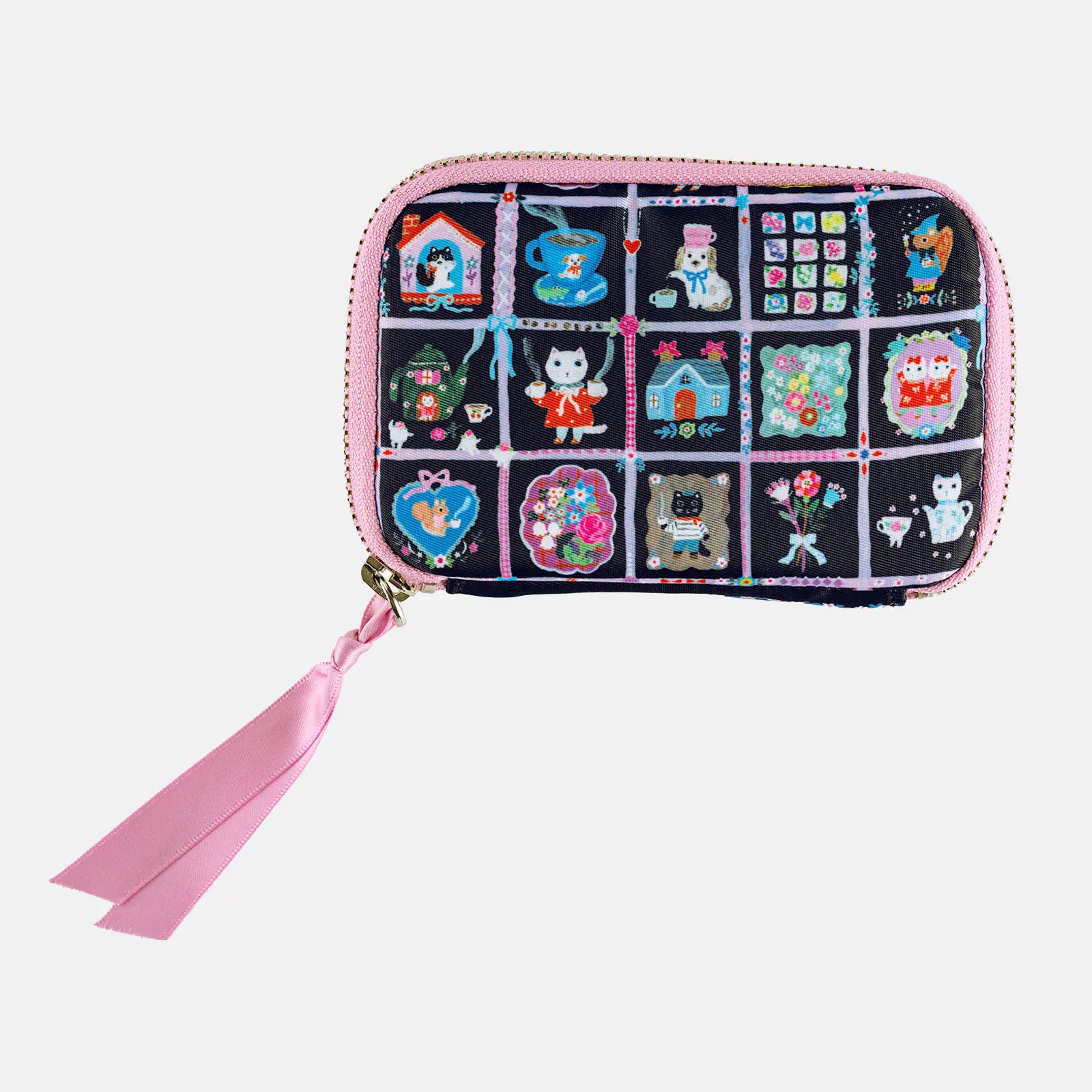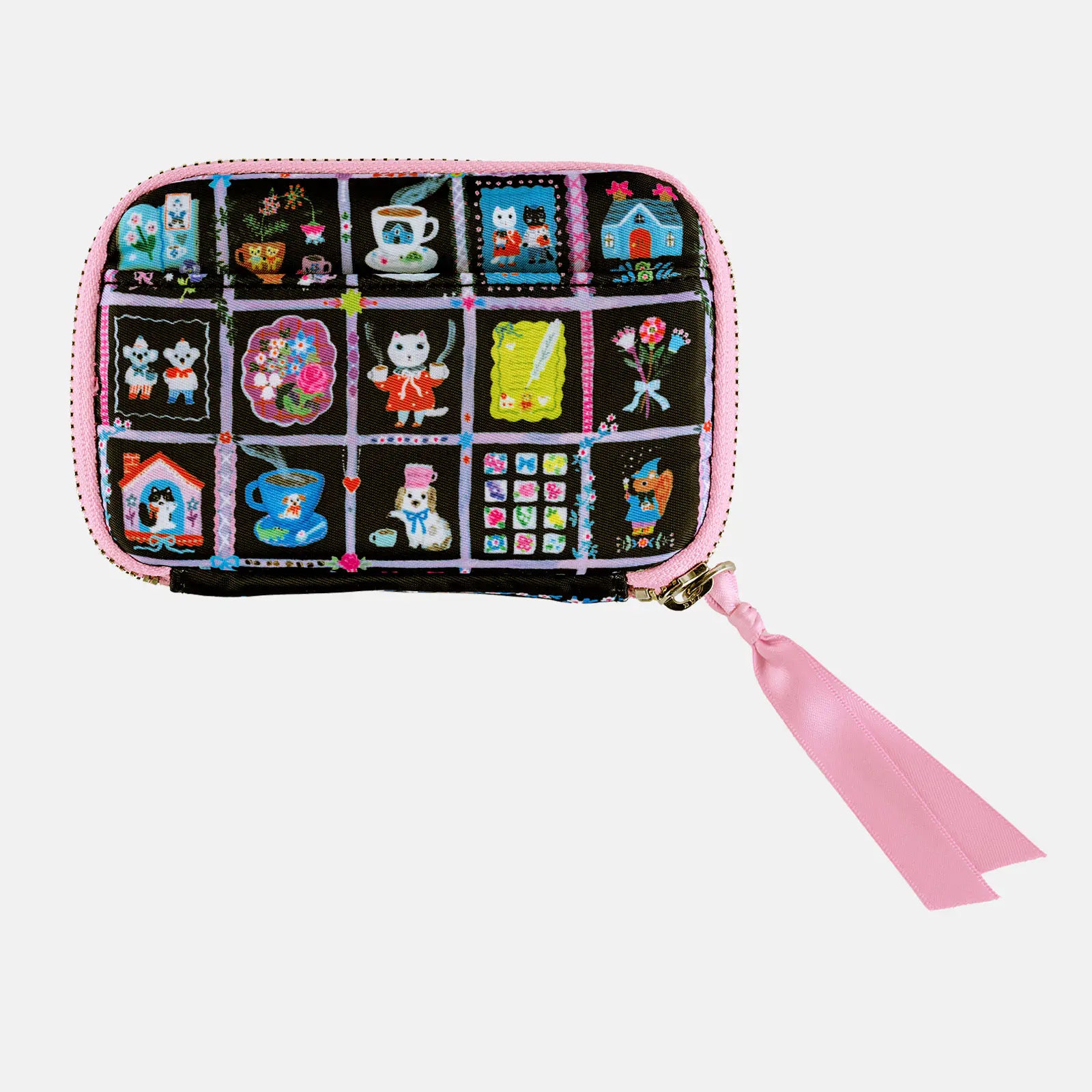 This pouch in the theme My Coffee brings illustrator Yumi Kitagishi’s drawings to life. It depicts a quiet and gentle time of relaxation, with a coffee in one hand as your companion. The black background is studded with colorful illustrations, and the pink binding and zipper pull of the case serve as accents. The interior is also in a pink shade.