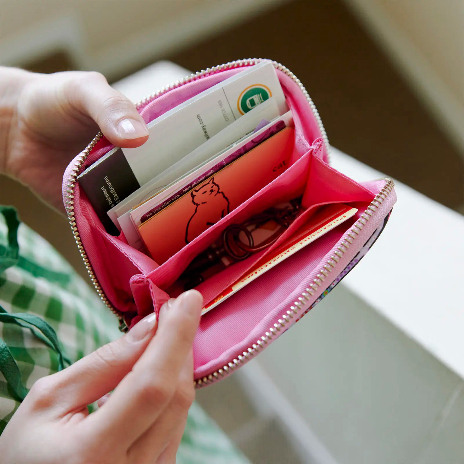The pouch opens accordion-style and is the perfect size for storing cards. The interior is split into four zones to allow for detailed organization. While compact, the pouch also has enough storage space to hold items with volume, such as lip balm and earbuds.